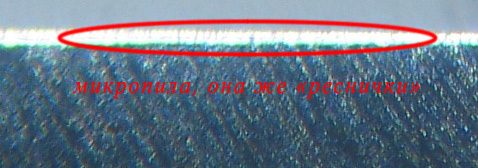 На мой взгляд уже названная микропила - это не что иное как самый обычный заурядный заусенец, острие которого мы периодически правим на ремне. В результате получается волнистость кромки (Неплоскостность в виде чередования гребней и впадин на кромках, образующихся из-за большей вытяжки длины кромки по сравнению с серединой листа).