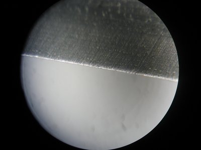 Вот фотка кромки моей японки после советского камня для правки бритв. Правда увеличение маловато  и с освещением надо разобраться.