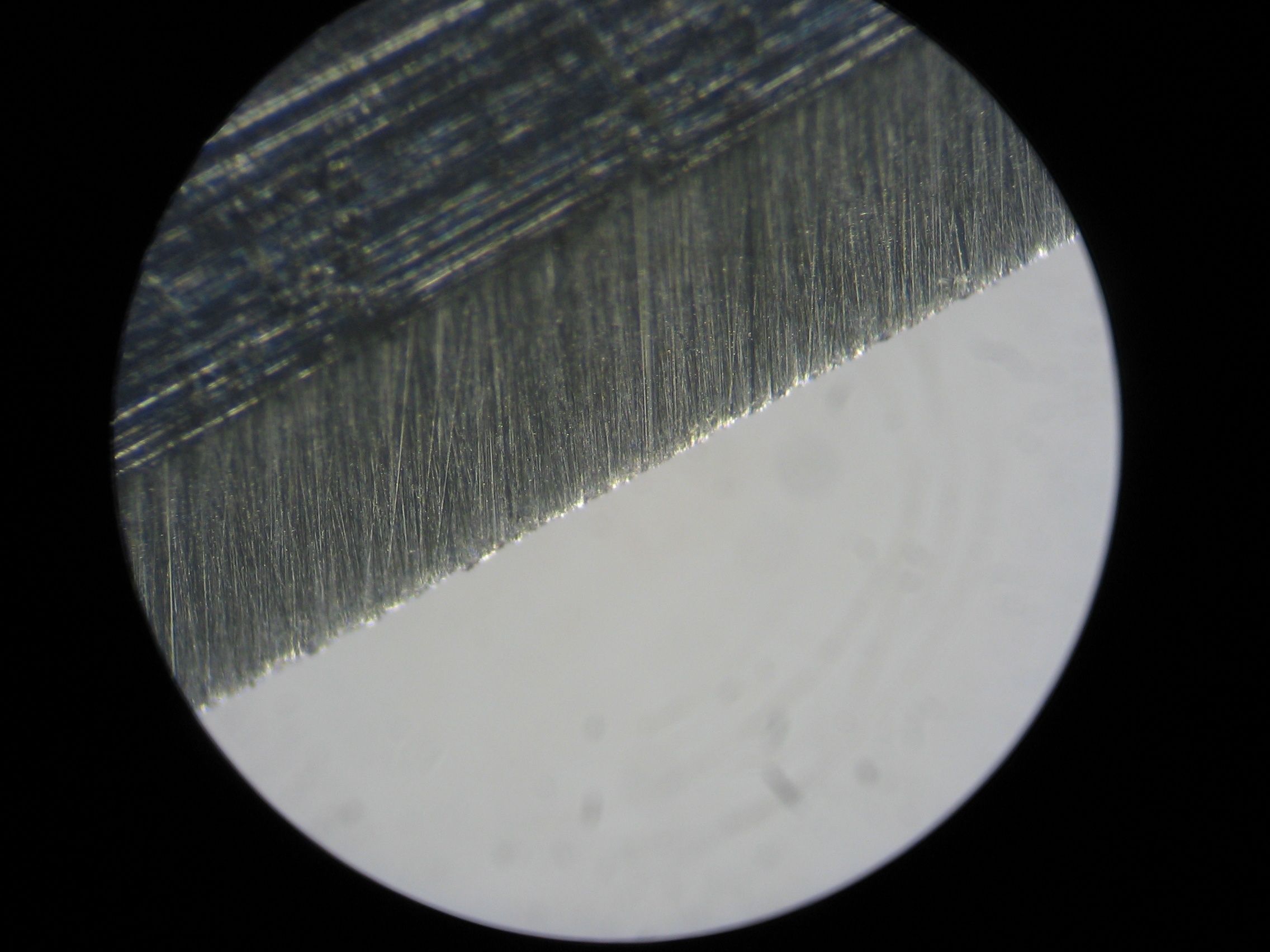 Бритва правилась на практически новом ремне, с виду совершено чистом. Фотка сделана 4 Mpx фотоаппаратом в микроскоп с ув. в X150, вырезан фрагмент фото так, что бы была видна РК во всю ширину, Ширина РК бритвы 1/6-1/8 мм.