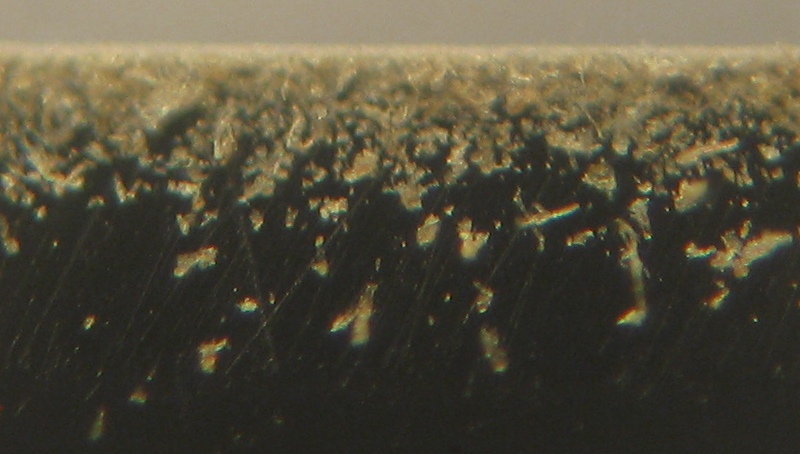 Re: Режущая кромка под микроскопомПроизвел отпуск кромки до темносоломенного цвета, 30 мин. в духовке. Заточил кромку , затем на керамогранит нанес алмазную патсу АСМ 1/о НОМ и довел до полировки. 3 маха на ГОИ (косые царапины)и + 5 махов на коже (почти без линзы)