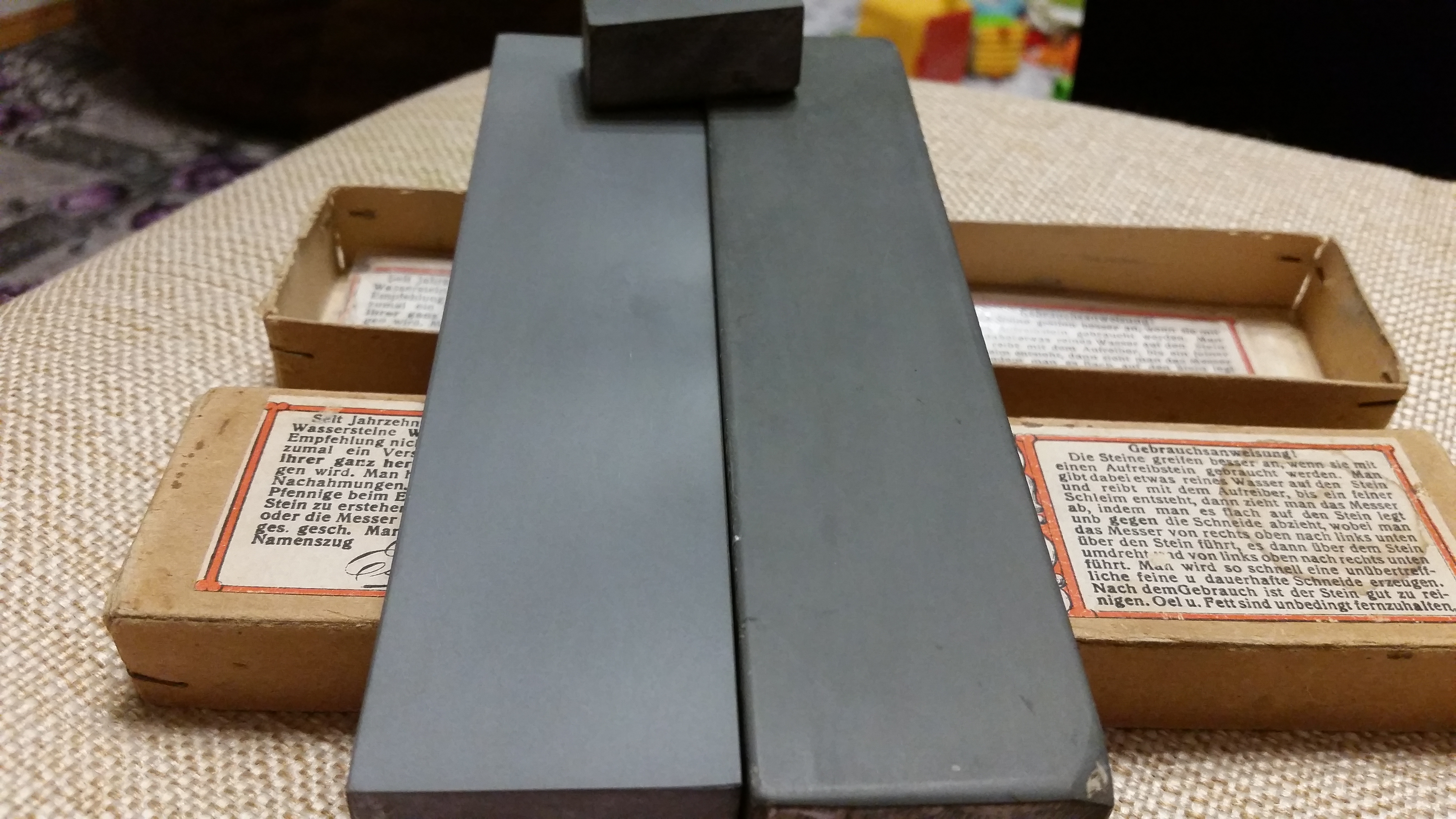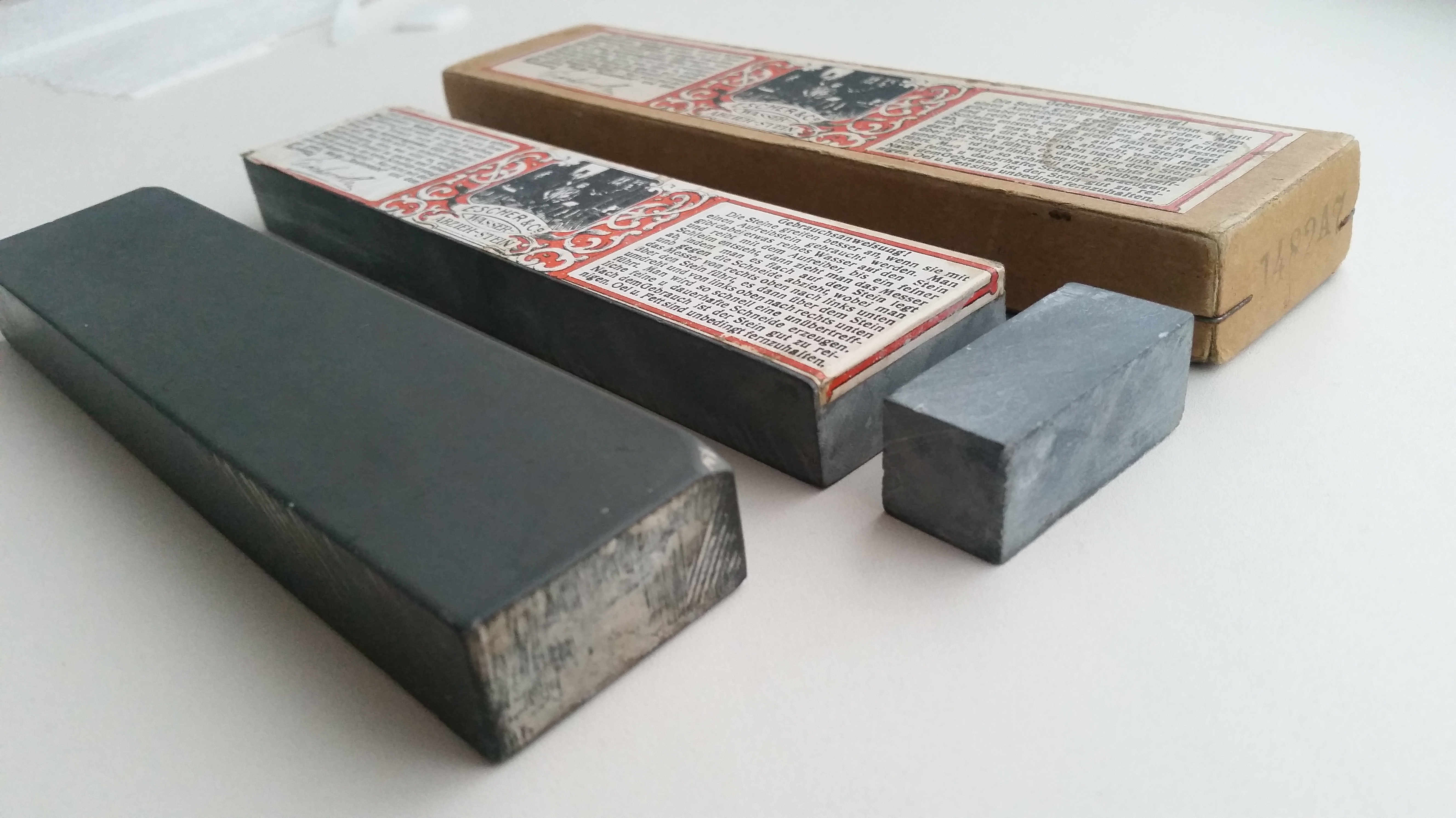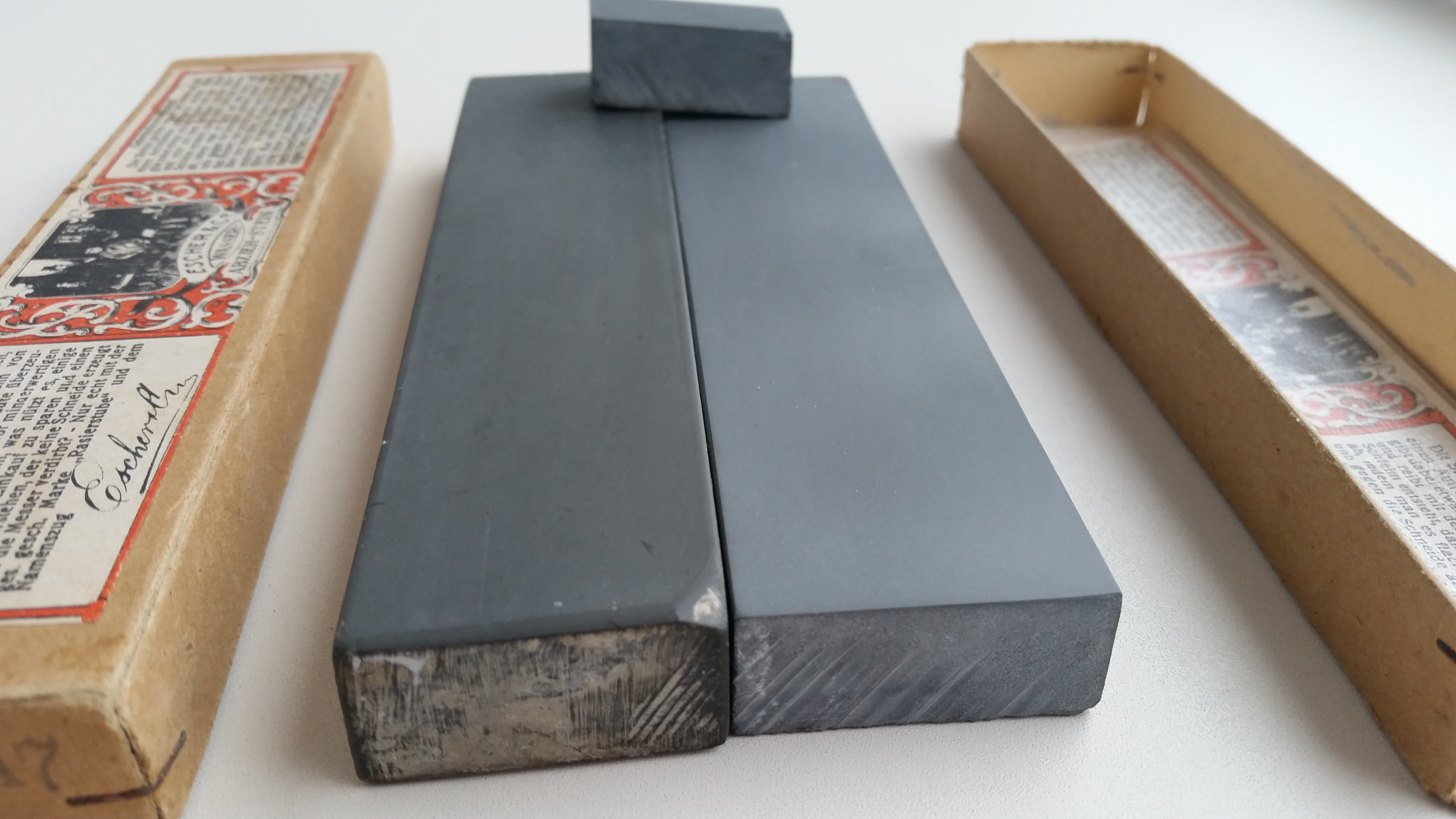 J.G. Escher companyLyapaDara, у меня два подобных камня. Тюрингиец в гробике 2.5*12.5 и желто-зелёный эшер с этикеткой в два раза шире с такой же длиной. «Вау» конечно нет, и нет по одной причине- итоговый результат одинаков, но разница между камнями есть. Разница в скорости работы и ощущении работы. На Эшере в разы быстрее и приятнее. Ты интуитивно понимаешь, что все, можно останавливаться. Тут, конечно, и ширина камня играет роль. Но если стоит выбор одного при одинаковых размерах- выбрал бы эшер. Тут второй момент включается, именно ты с ним не согласишься, но... этикетка даёт хоть какую-то гарантию новичку. Есть огромная вероятность, что при отсутствии результата виноваты руки, виновата техника и методика заточки, а не камень. А стоит ли переплачивать... Если есть деньги, то почему бы не заплатить за эту этикетку и хоть какую-то гарантию качества. Да и этикетки очень красиво в рамочке смотрятся))
