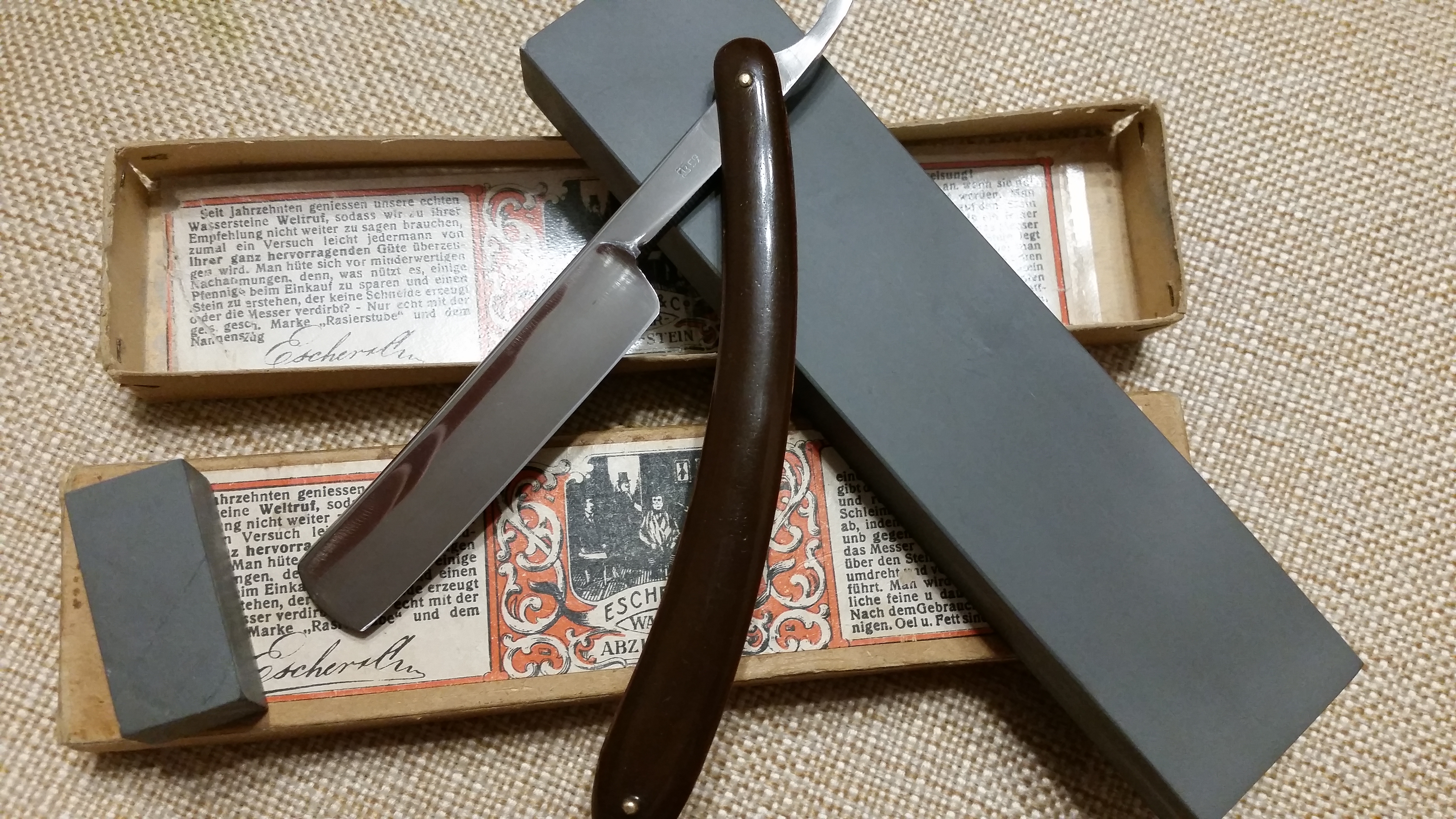 J.G. Escher companyВ процессе, но КМК, он глаже не станет, поверхность обновляется после слурика. Вот второй мой более черный, он уже после притирки был очень гладкий, он из самого слурика вышибает суспензию. Но посмотрим, в ближайший месяц все бритвы только буду на Эшере финишировать, чтобы понять камень