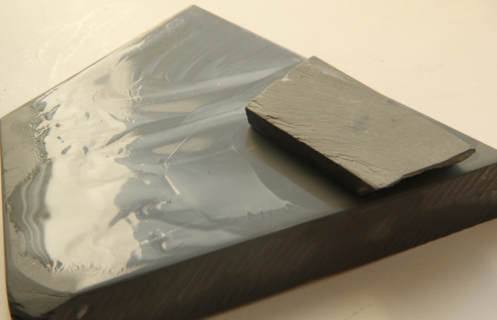 Один из них в коробке и имеет родной слурик. Другой продавался без всяких атрибутов, но по пришествии я сделал вывод, что ничем он не отличается от атрибутированного, кроме как цветом. Кстати обратите внимание, на фото рядом лежит сланец от Петера. По цвету они совершенно идентичны со вторым не атрибутированным эшером. По зрелому размышлению решил старый камень от Петера попилить на слурики и присовокупить один к своему светло-зеленому 7 дюймовому.
