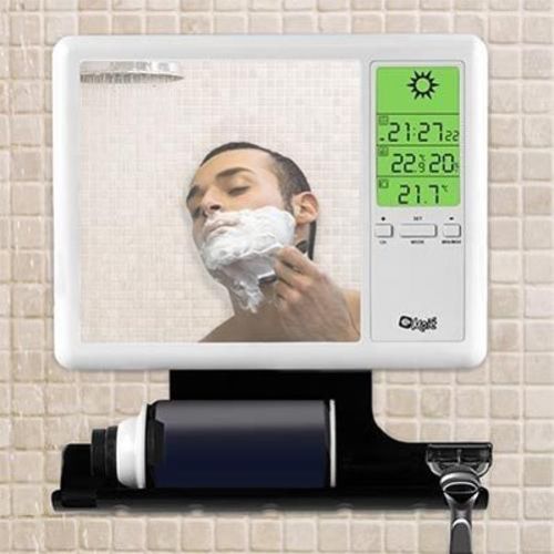Типа незапотевающее зеркало для ванной со встроенной погодной станцией (с беспроаодным датчиком). В комплекте два бритвенных станка и баллон пены.