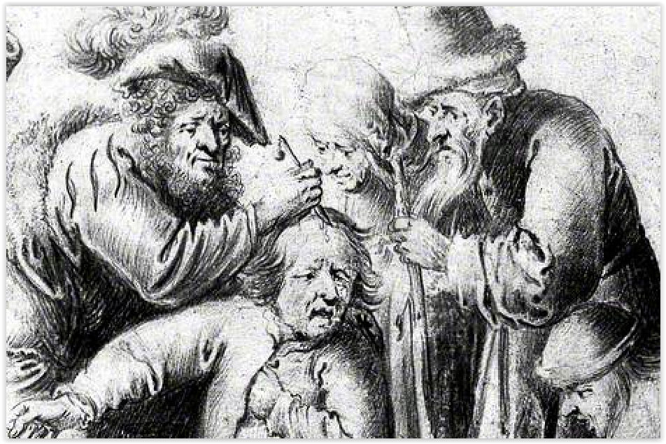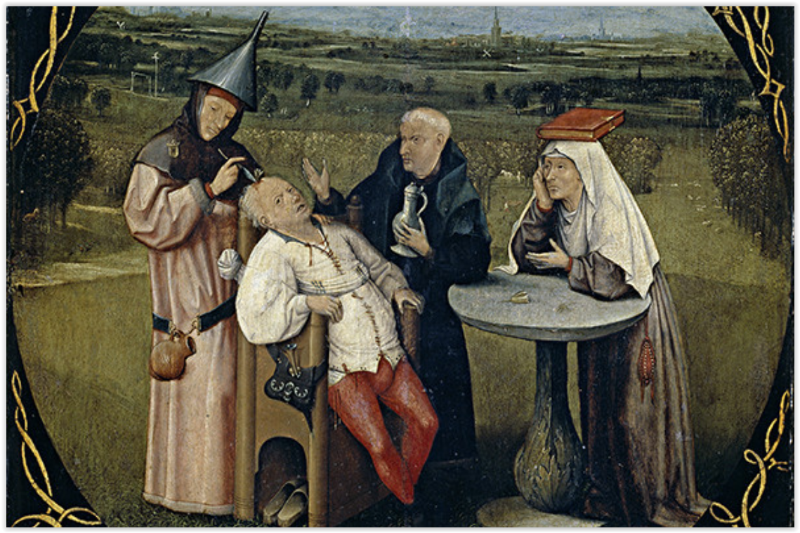 Идея, изображенная здесь, заключалась в том, что безумие можно вылечить путем хирургического извлечения камня из головы пациента. Не удивляйтесь, в далеком прошлом таким образом пытались „излечить” эпилепсию и психических заболеваний. Цирюльники-хирурги симулировали удаление камня из головы пациента, но самом деле удаляли атеромы - опухолевидное образование, возникающее в результате закупорки протока сальной железы.