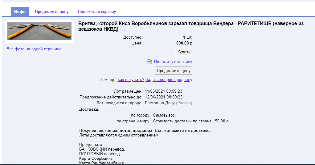 Аукционы: плагиат, развод и "великолепные" описанияХоть бы авито-доставку что ли подключил, я бы может заказал((