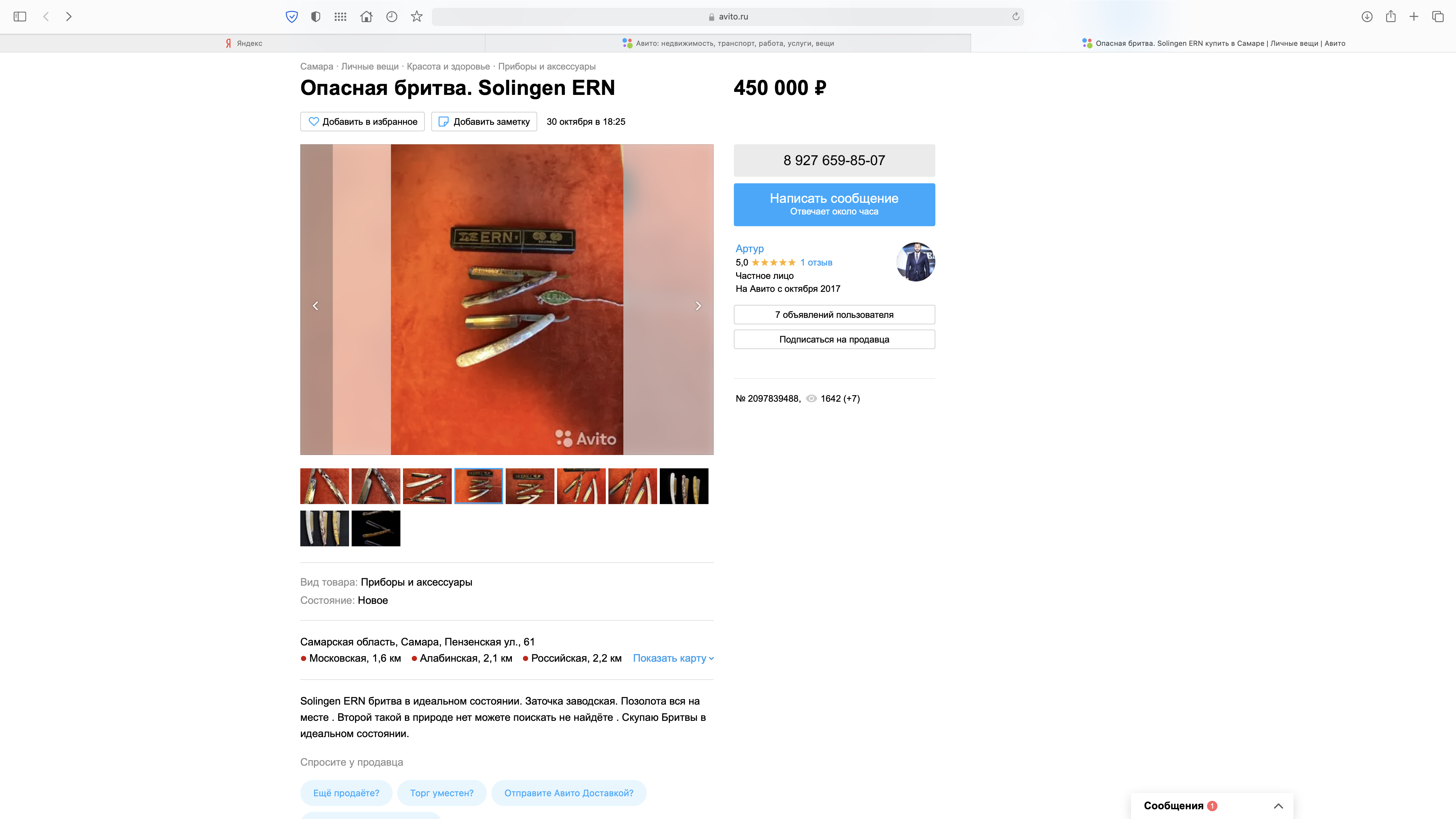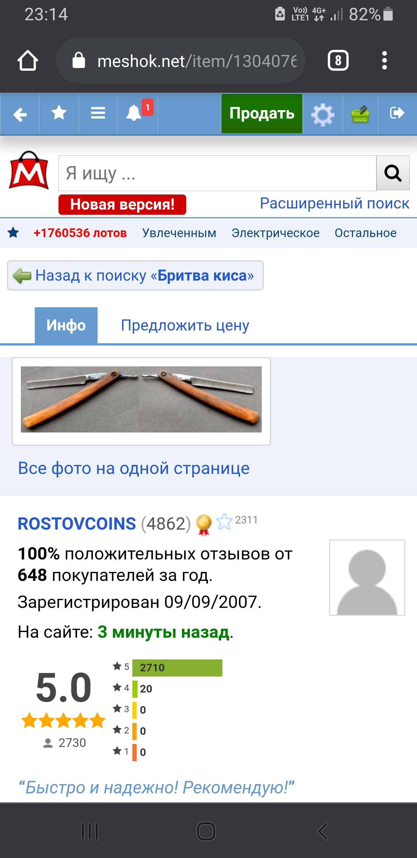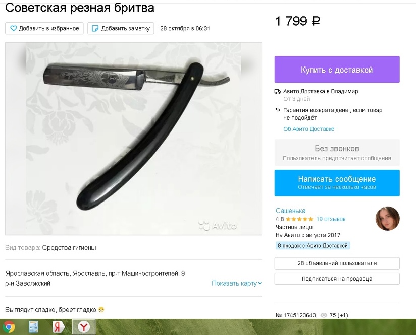 Аукционы: плагиат, развод и "великолепные" описанияНа Мешке продавец с ником SUMRAK__ продает Вачу интересную, но повадки у него матерого кидальщика - я купил у него лот по фиксированной цене, указано место - Москва, доставка по городу указана 300руб. Я запросил самовывоз, продавец отказался, мол никаких личных встреч, только почтой отправляю. Но в описании лота об этом ничего не указал. Тогда я прошу - подтверди, что товар в наличии у тебя - сделай фото бритвы на фоне листка с ником и текущей датой. Тогда оплачу доставку. В ответ присылает совсем мутные фотки, без клейма и прочих идентификационных данных. А главное - без своего ника и даты в кадре. Объясняя тем, что бритва НЕ у него. И пишет, мол давай без шума разойдемся, проходи, не мешай. Я отказался от сделки.