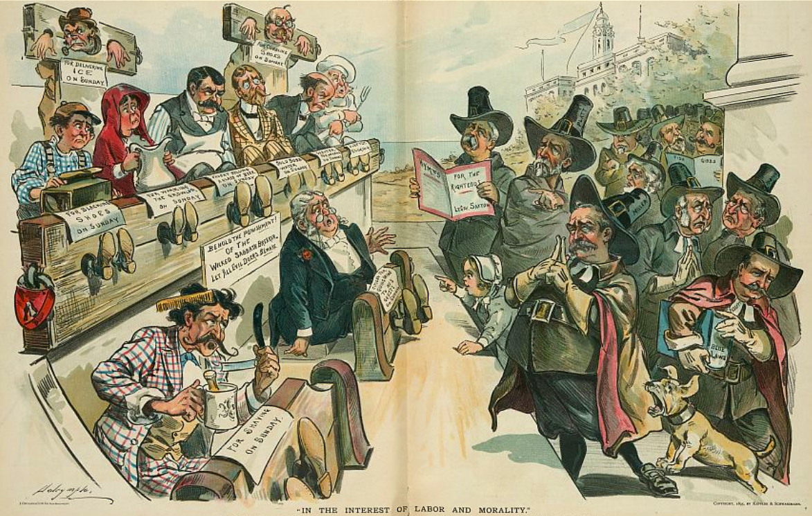 „In the interest of labor and morality” „В интересах труда и нравственности”, 1895 г. Карикатура показывает слева многих бизнесменов и женщин в колодках и позорных столбах за такие „правонарушения”, как подача гостям вина в воскресенье, за бритье в воскресенье, за продажу стакана пива в воскресенье, за чистку обуви в воскресенье и т. д. Взглянем поближе: