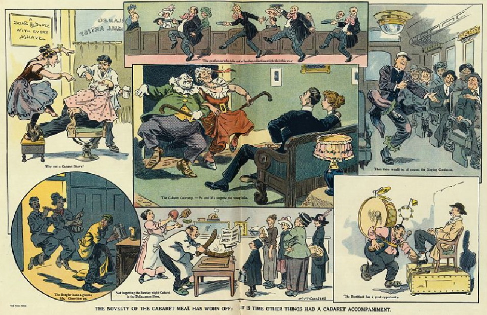 „The novelty, of the cabaret meal has worn off; it is time other things had a cabaret accompaniment” „Новизна, еды в кабаре улетучилась; пришло время другим вещам иметь аккомпанемент кабаре”, 1913 г. Надпись: „A Song & Dance With Every Shave” „Песня и танец при каждом бритье”