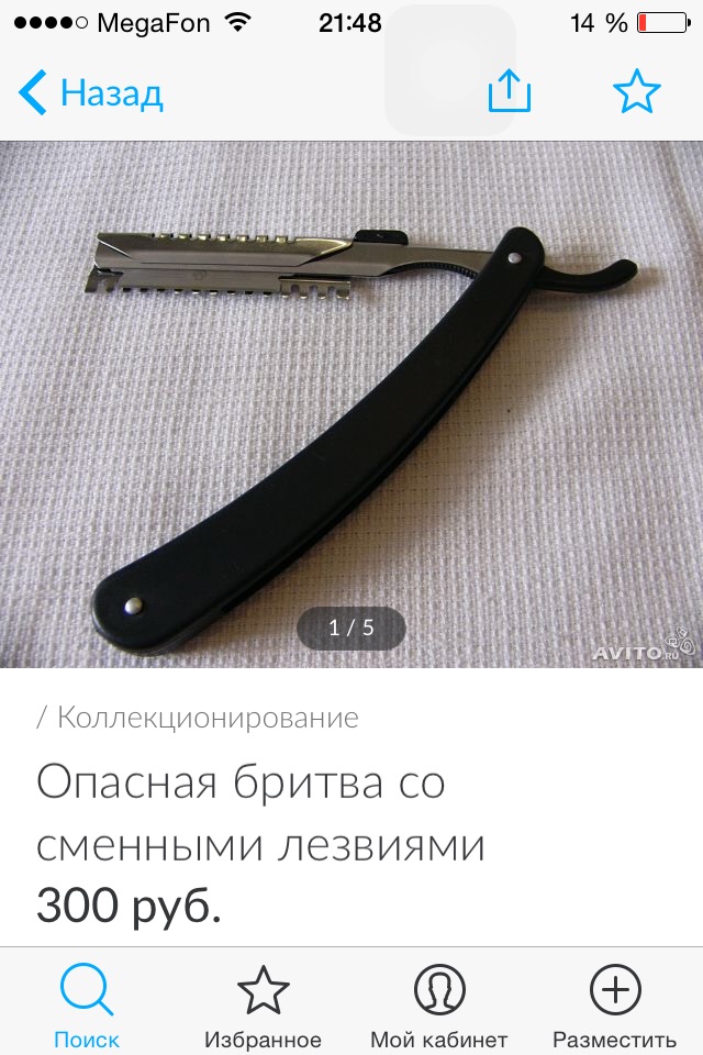 Re: Аукционы: плагиат, развод и "великолепные" описанияУ нас тут бритву продают на http://www.tori.fi" onclick="window.open(this.href);return false; . Цена 32€.  В объявлении читаем: "старая кованая кузнецом опасная бритва." Ну и в придачу ремень. Может и не развод никакой (в смысле может кто и ковал сам)   Или просто приварили к железке в виде ножика кусок мет. полоски и это стало типa опасной бритвой. http://www.tori.fi/pirkanmaa/Vanha_Part ... ?ca=18&w=3" onclick="window.open(this.href);return false;