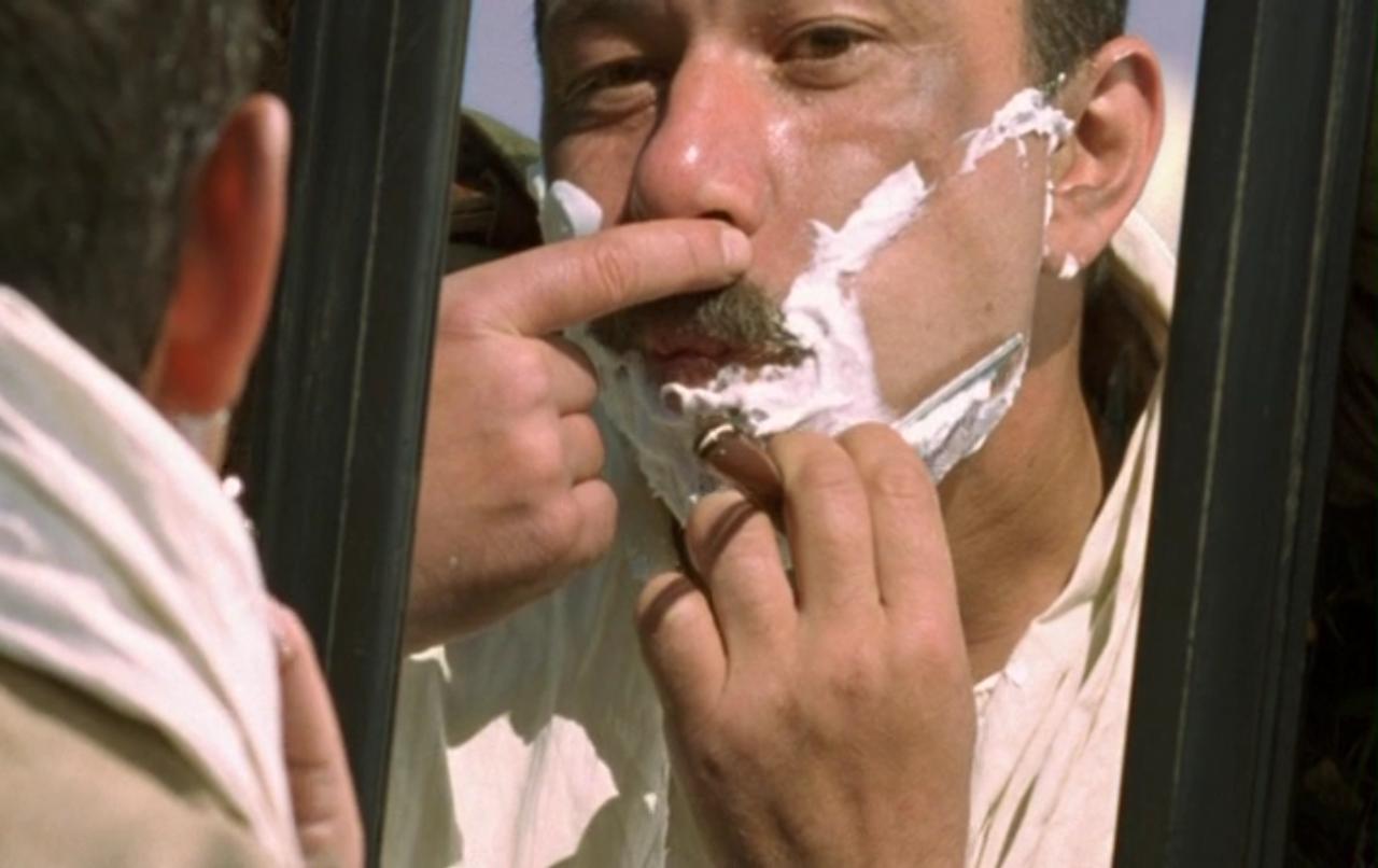 Re: Фильмы с участием опасной бритвы"Иисус. Бог и человек". Режиссер Роджер Янг, 1999 год. Бритье, а точнее- подбривание бородки Понтия Пилата (в исполнении Гарри Олдмена) римской бронзовой бритвой с использованием такого же зеркала.
