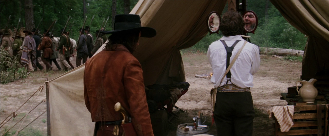 Сцена бритья Сэма Хьюстона в исполнении актера Денниса Куэйда перед решающей битвой битвой у Сан-Хасинто, где техасская армия всего за 18 минут вдребезги разбила ударный мексиканский отряд. В честь этого исторического персонажа назван город Хьюстон, четвертый по величине среди городов Соединенных Штатов и крупнейший город штата Техас. Очень понравилось походное подвесное (на цепочке) зеркало-трюмо- умели всё-таки в изящном 19-ом веке делать красивые вещи Волхвы не боятся могучих владык,