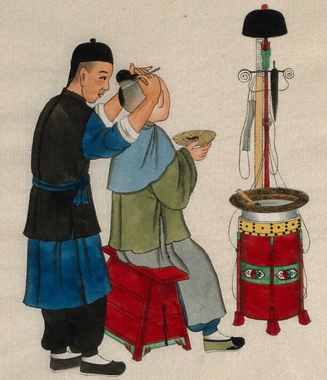И сново Zhou Peichun of Peking or Zhao Pei Qun (Чжоу Пэйчунь из Пекина или Чжао Пей Цюнь) был художником из Китая, процветавшим во времена поздней династии Цин. Чжоу Пэйчунь и его студия производили альбомы картин, изображающих занятия, костюмы и обычаи Китая, и продавали их иностранцам. „A barber shaving a man's head” „Цирюльник бреет голову мужчине” 1890 г. Взглянем поближе: С 2013 г. с кайфом бреюсь опасной бритвой пять раз в неделю, в три прохода.