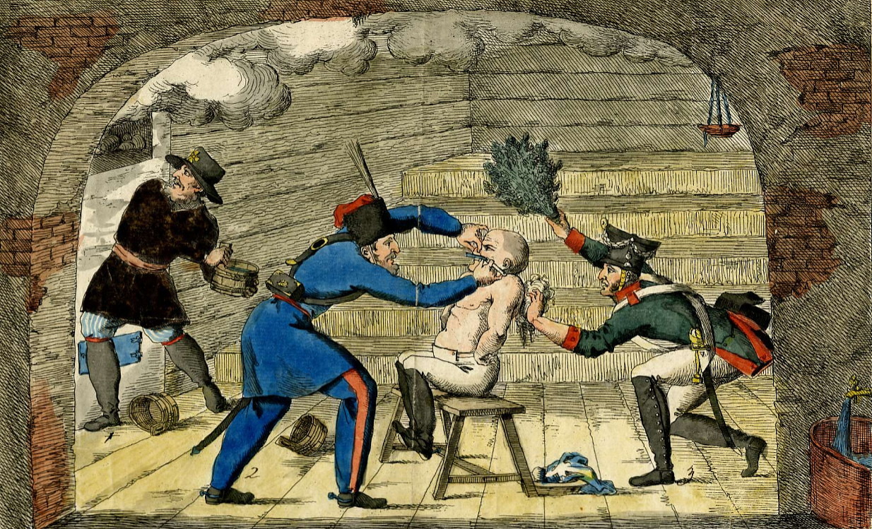 Может быть, тебе понравится исконно русская картина акварелью. Иван Иванович Теребенёв (Ivan Ivanovich Terebenev), 1780 г.-1815 г. - русский скульптор и график. Наибольшую известность Теребенёв приобрёл как автор гравированных карикатур, связанных с вторжением Наполеона в Россию - „Теребеневских листов”, высмеивавших императора Наполеона и его армию, восхвалявших русских солдат и партизан. Работы Теребёнева находились на стыке официальной пропаганды, британской карикатуры и русского народного лубка, и пользовались огромной популярностью у населения. Вот один из „Теребеневских листов”: „Наполеон у русских в бане” „Napoleon in the Russians' Bathhouse”, 1813 г. Надпись под изображением: Н ... нъ у Русскихъ въ банѣ. Н: Эдакаго мученья я съ роду не терпѣлъ! меня скоблятъ и жарятъ какъ в аду.... Ратн: Отдувайся, коли самъ полѣзъ в Русскую баню; попотѣй хорошенько, а мы неустанемъ поддавать пару. Солд: Натремъ тебѣ и затылокъ и спину, и бока; будешь помнить легкую нашу руку. Коз: Побрѣемъ тебя погладимъ, молодцомъ поставимъ. Иванъ Теребеневъ Взглянем поближе: И еще поближе: