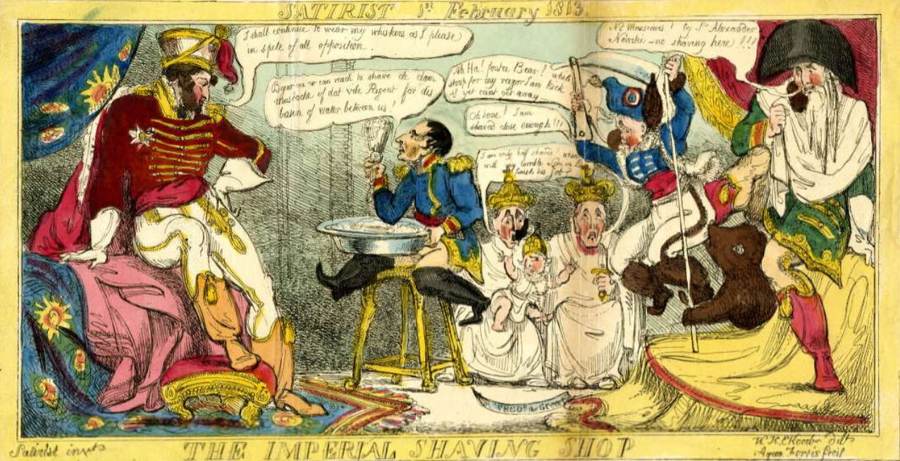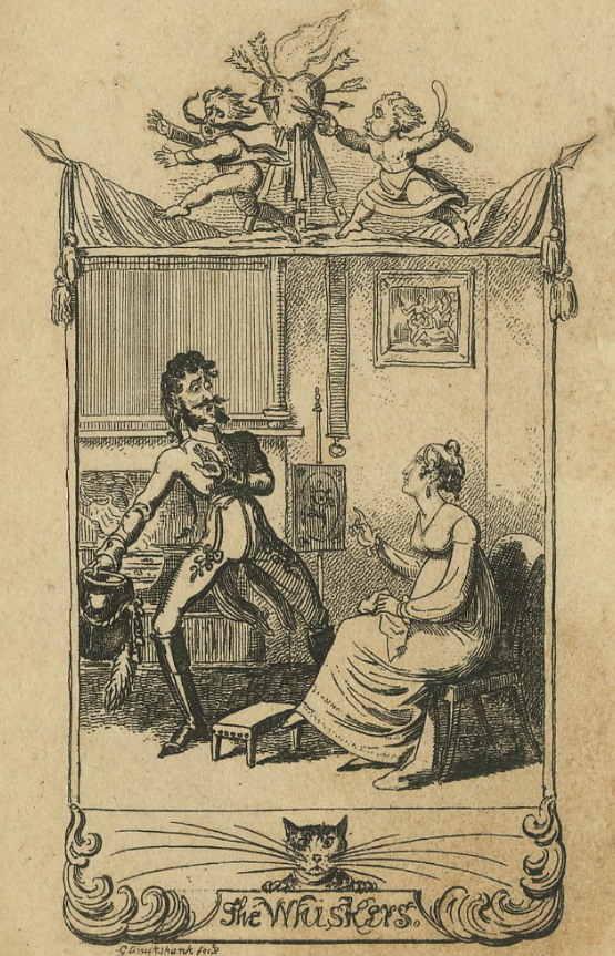 „The Whiskers” „Усы”, 1818 г. Швейцарский офицер в форме, с выражением удивления на лице, отшатывается от сидящей на стуле дамы, которая просит его сбрить усы. Виньетка с двумя фигурами херувимов, одна с большими усами убегает от другой, преследующей ее с ножницами и опасной бритвой: С 2013 г. с кайфом бреюсь опасной бритвой пять раз в неделю, в три прохода.