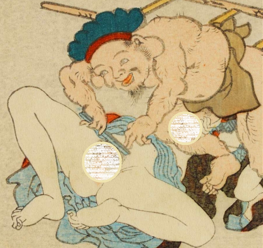 Специально для вас выложу замечательную картину - японская эротика с бритвой! Олег Бритва, я ее зацензурировал, но если так не годится, удалю без вопросов. Utagawa Kunisada (Toyokuni III) (1786-1864). Утагава Кунисада, известен также как Утагава Тоёкуни III - крупнейший японский художник и мастер цветной графики периода Эдо. Эксперты считают, что он или художник его школы является автором этой картины. „Daikoku shaving а woman” „Дайкоку бреет женщину” Взглянем поближе: