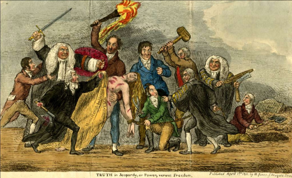 „Truth in jeopardy, or power, versus freedom” „Истина в опасности или власть против свободы”, 1811 г. (Обнаженное тело Истины, тяжело раненное топором, поддерживает лорд Холланд против атак тех, кто пытается завершить ее убийство). Справа лорд Элдон радостно править огромную бритву с надписью „Сатира”: С 2013 г. с кайфом бреюсь опасной бритвой пять раз в неделю, в три прохода.