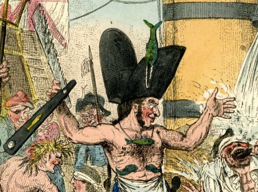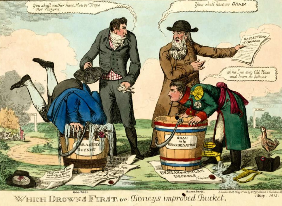 „Which drowns first” „Кто утонет первым” Сатира по поводу Берлинского и Миланского декретов подписанные Наполеоном. Сэр Чарльз Мордаунт держит проволочные мышеловки и бритвы: С 2013 г. с кайфом бреюсь опасной бритвой пять раз в неделю, в три прохода.