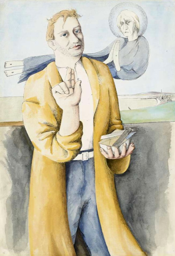 „Buck Mulligan” „Бак Маллиган” 1948 г. Иллюстрация к роману Джеймса Джойса „Улисс”. Название картины взято из первых слов романа: „Величественный пухлый Бак Маллиган вышел с лестницы, неся таз с пеной, на котором зеркало и бритва”. Взглянем поближе: С 2013 г. с кайфом бреюсь опасной бритвой пять раз в неделю, в три прохода.