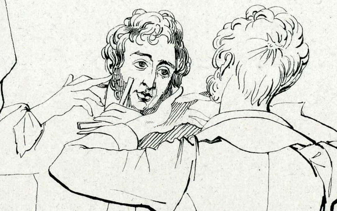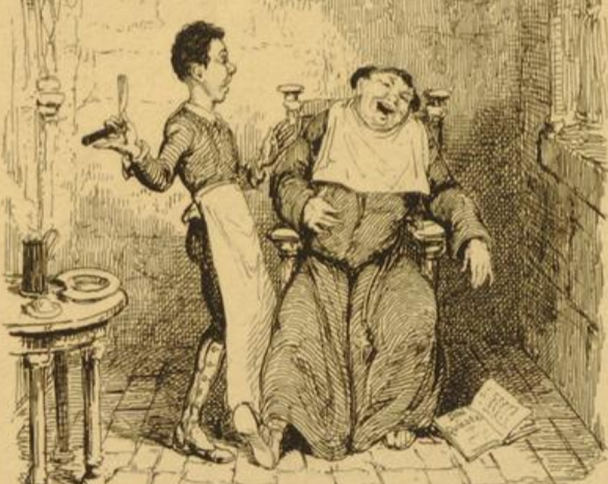 „Lazaro shaving the friar” „Лазаро бреет монаха”, 1837 г. (Иллюстрация к книги „Прогулкам по стопам Дон Кихота” Инглиса). Взглянем поближе: С 2013 г. с кайфом бреюсь опасной бритвой пять раз в неделю, в три прохода.