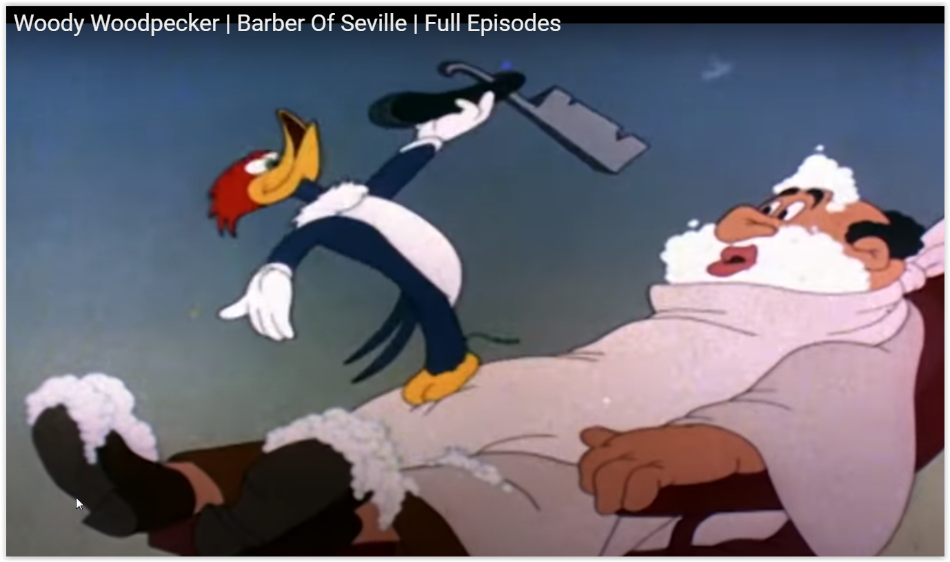 США 1950 г., мультфильм Занимает 12 место в списке 50 величайших мультфильмов. Режиссёр: Чак Джонс В главных ролях: Багз Банни и Элмер Фадд Ссылка с привязкой ко времени: „The Barber of Seville”, „Севильский цирюльник” США 1944 г., мультфильм Занимает 43-е место в списке 50 величайших мультфильмов. Режиссёр: Шамус Кулхейн В главной роли: Woody Woodpecker - Вуди Вудпекер (в переводе - дятел Вуди) (Ради правды, надо сказать, что мультик упоминается в теме, но без надлежащей информации). Ссылка с привязкой ко времени: С 2013 г. с кайфом бреюсь опасной бритвой пять раз в неделю, в три прохода.