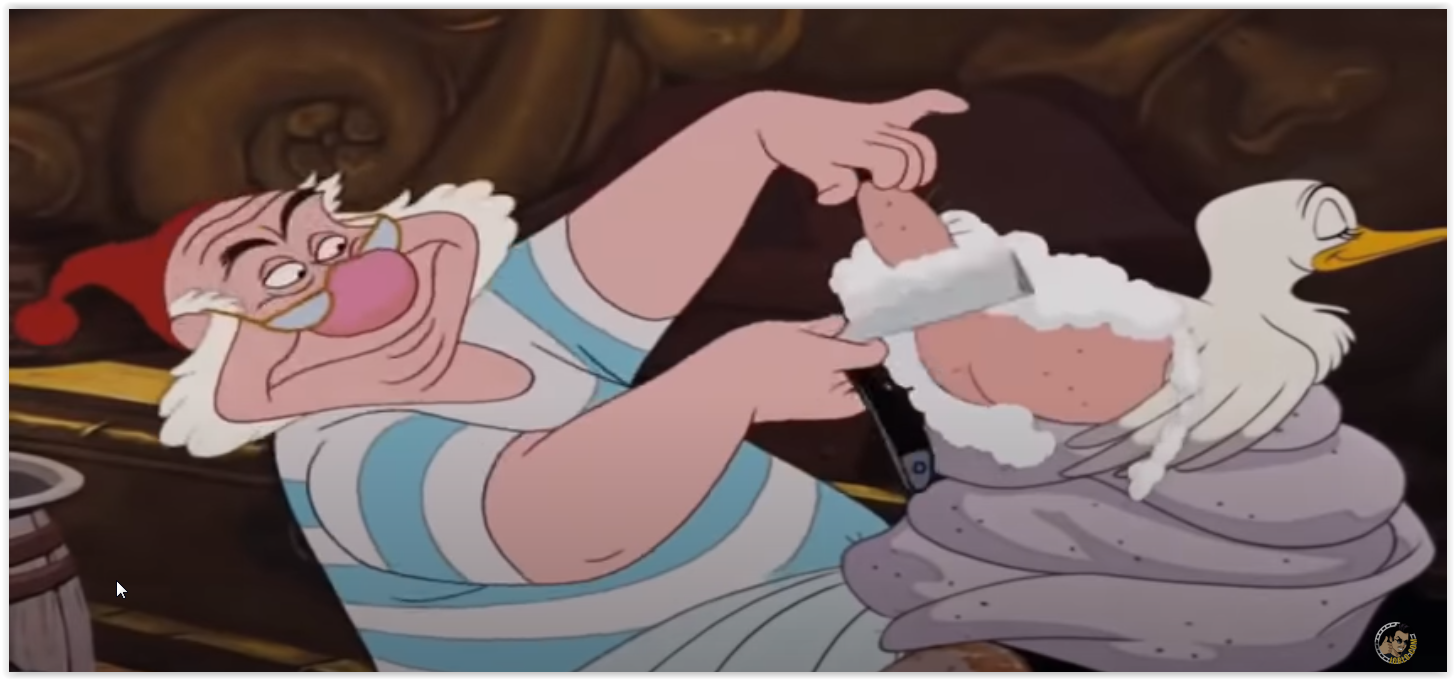 США 1953 г., мультфильм Режиссёры: Клайд Джероними, Уилфред Джексон, Гамильтон Ласк В данной сцене участвуют: мистер Сми, капитан Крюк и чайка. Ссылка с привязкой ко времени: Специально для тех, кто хотят посмотреть весь мультфилм, вот пожалуйста, ссылка на официальном ресурсе „disneycartoonsonlineforfree”, сцена бритья на 25м.07с.: https://disneycartoonsonlineforfree.blo ... nline.html Правка бритвы на подошве: Бритье жопы чайки: