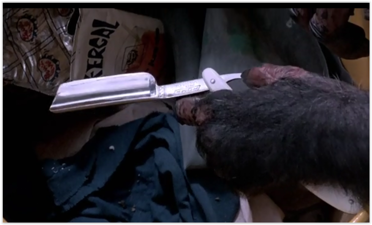 Италия 1985 г. Режиссёр: Дарио Ардженто В главных ролях: Дональд Плезенс, Дженнифер Коннелли и др. Первая сцена: Смотреть с 1.21.50 - шимпанзе находит опасную бритву. (надпись, вроде „PUMA”). Вторая сцена: Смотреть с 1.51.46 - шимпанзе убивает преступницей опасной бритвой. Ссылка без привязкой ко времени: https://filmix.ac/filmi/triller/17024-f ... -1985.html С 2013 г. с кайфом бреюсь опасной бритвой пять раз в неделю, в три прохода.