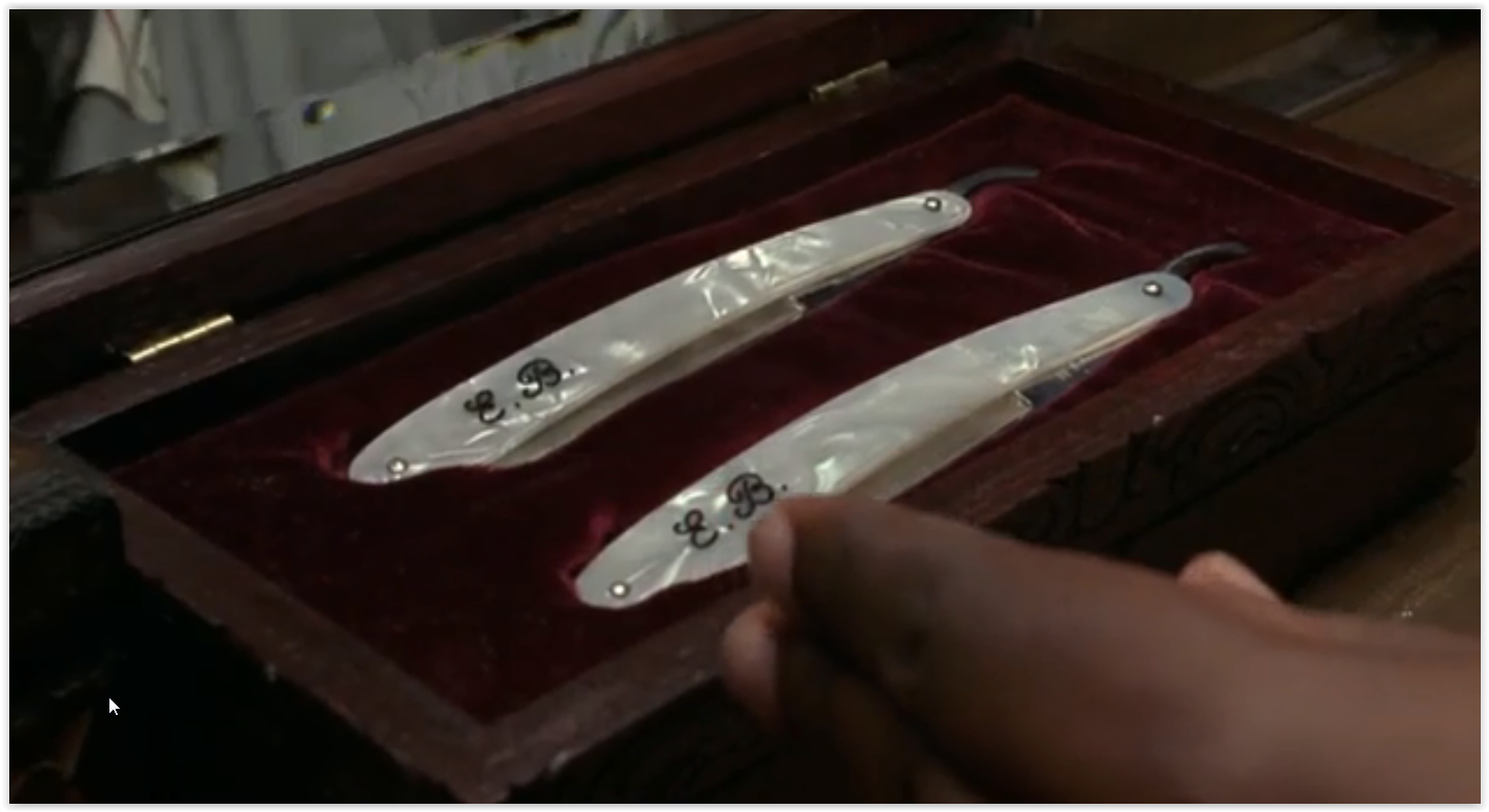 „The Tale of Sweeney Todd” „Сказка о Суини Тодде” США, Ирландия 1997 г. Режиссёр: Джон Шлезингер В главных ролях: Бен Кингсли, Джоанна Ламли и др. Ссылки с привязкой ко времени. Рекордное количество сцен - 8 штук! Наслаждайтесь! Первая сцена - правка. Вторая сцена - бритье. Третья сцена - правка и бритье. Четвертая сцена - правка и бритье. Пятая сцена - правка и бритье. Шеста сцена - правка и бритье. Седьмая сцена - срезание пучка волос. Восьмая сцена - убийство.