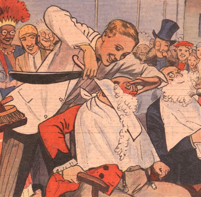 „Crossing The Line”; Prince Edward VIII of Wales plays the role of a barber on board of the liner „Kenilworth Castle”, on her way to South Africa” „Пересечение экватора; Принц Уэльский Эдуард VIII играет играет роль цирюльника на борту лайнера „Kenilworth Castle”, на пути в Южную Африку”. Взглянем поближе: С 2013 г. с кайфом бреюсь опасной бритвой пять раз в неделю, в три прохода.