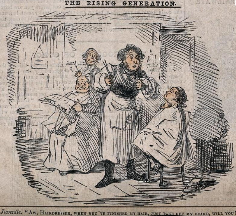 „The rising generation. Juvenille: hairdresser, when you've finished my hair, just take off my beard, will you?” „Подрастающее поколение. Несовершеннолетний: Цирюльник, когда вы закончите мою прическу, просто снимите мне бороду, хорошо?” Взглянем поближе: И сново John Leech (Джон Лич). Он нарисовал еще одну подобную картину. „The rising generation. Juvenille: hairdresser, when you've finished my hair, just take off my beard, will you?” „Подрастающее поколение. Несовершеннолетний: Цирюльник, когда вы закончите мою прическу, просто снимите мне бороду, хорошо?” Взглянем поближе: С 2013 г. с кайфом бреюсь опасной бритвой пять раз в неделю, в три прохода.
