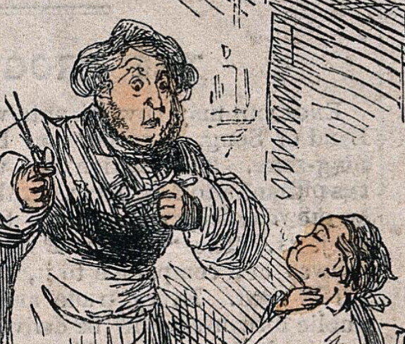 Исаак Роберт Круикшанк, иногда известный как Роберт Круикшанк, был карикатуристом, иллюстратором и портретистом-миниатюристом, менее известным братом Джорджа Круикшенка. „Country fair” „Деревенская ярмарка”, 1828 г. (Цирюльник вырывает больной зуб, а рядом Арлекин, танцующий с бритвой). Взглянем поближе: С 2013 г. с кайфом бреюсь опасной бритвой пять раз в неделю, в три прохода.