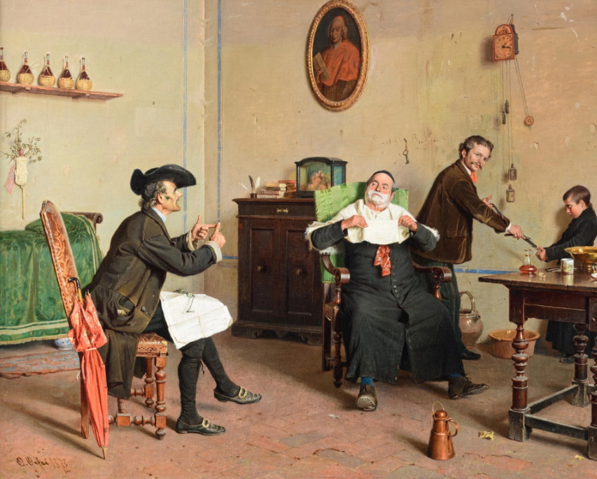 Orfeo Orfei (1836-1915). Орфей Орфей был итальянским художником, в основном работающим в жанрах рабочего класса, за работой или игрой. „Discussing the day's news during the shave”, „Обсуждение новостей дня во время бритья”, 1873 г. Правка бритвы на подвесном ремне: На столе вторая бритва: С 2013 г. с кайфом бреюсь опасной бритвой пять раз в неделю, в три прохода.
