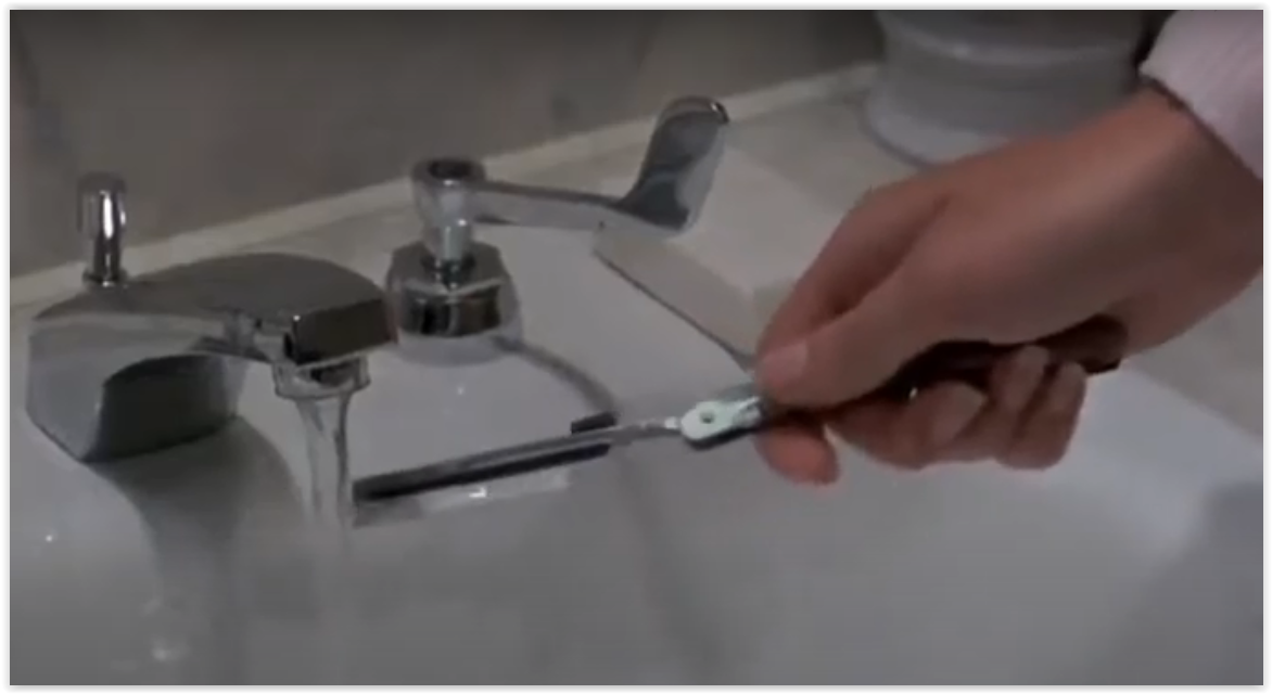 Актер (играющий штабс-капитана отечественных спецслужб начала века) довольно талантливо имитирует процесс: наносит немного жидковатую пену, затем бреется - по росту волоса, и по горлу против роста, причем оттягивая кожу. Канонічески даже мастерски обтирает в конце об х/б ткань бритву, держа её жалом вверх и проводя по всей длине лезвия от пятки, как это рекомендуется в инструкциях.
