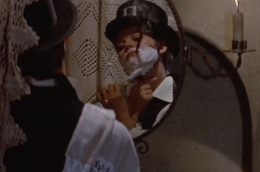 Сцена подбривания испанской бородки гранда была бы совершенно шикарна, если бы актер, играющий цирюльника, большую часть времени не держал бритву под уголом 90 градусов. Омерзительно( Вся бритвенная романтика убита