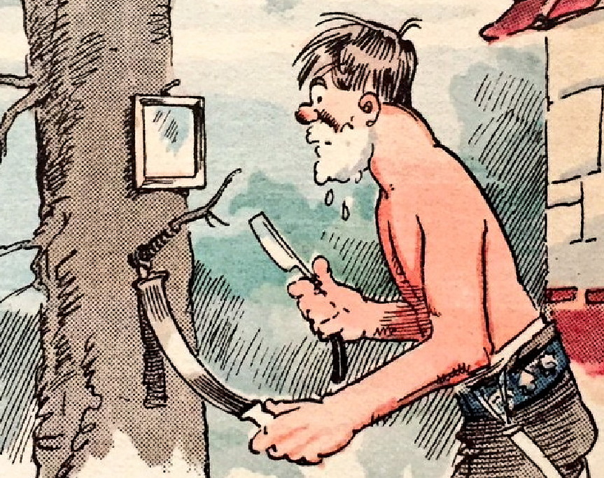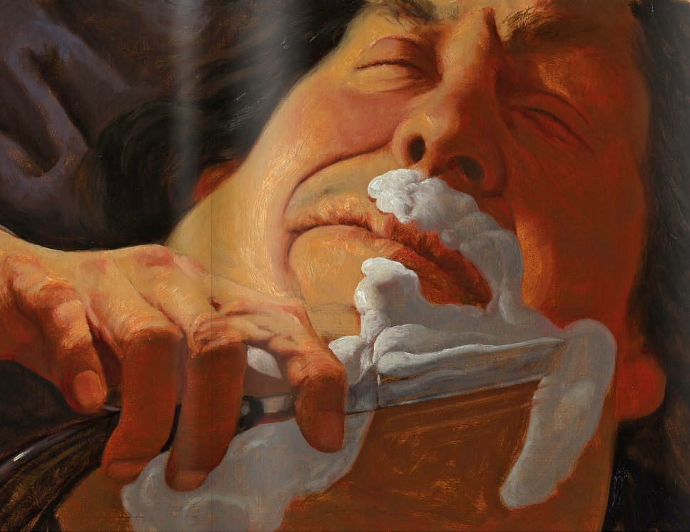 Иллюстрации к книги Р. Спроула (R.C. Sproul 1939-2017) „The Barber Who Wanted to Pray” „Цирюльник, который хотел молиться”, 2011 г. Первая иллюстрация: Вторая иллюстрация. Цирюльник поменял руки и уже бреет левой: Взглянем поближе: С 2013 г. с кайфом бреюсь опасной бритвой пять раз в неделю, в три прохода.