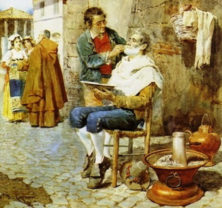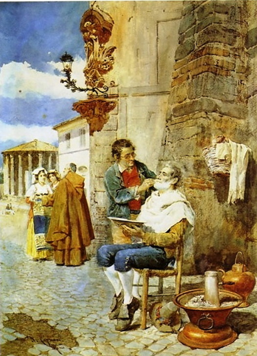 Он известен своими жанровыми сценами. „The barber at Foro Boario” „Цирюльник в Foro Boario” Foro Boario, лат. Forum Boarium - Бычий форум - древнейший форум (торговая площадь) Рима. Взглянем поближе: -------------------------------------------------------------------------------------- Scheermes, позволь объяснить, что картин, гравюр и особенно фото с опасной бритвы без информации полным полно, именно поэтому, здесь принято написать дополнительную информацию: имя автора, год рождения и смерти, национальност, в каком году написана картина/гравюра/фотография и т. д. или на худой конец, в какой газете и в каком году она печаталась. И еще, неписаное правило гласит, что нельзя выкладыват сразу после другого человека, а надо подождат несколько часов, чтобы его пост стоял спереди. Таким образом проявляем уважения к чужого труда! Надеюсь, ты меня правильно понял. Олег Бритва, я давно приметил картину Яна Хендрика Хейманса здесь