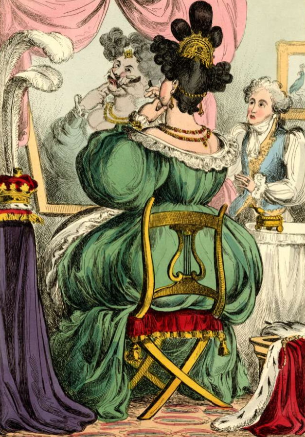 „Preparing for St Georges day” „Подготовка к дню Святого Георгия”, 1830 г. (Политическая карикатура - герцогиня Сент-Олбанс бреет верхнюю губу). Взглянем поближе: С 2013 г. с кайфом бреюсь опасной бритвой пять раз в неделю, в три прохода.