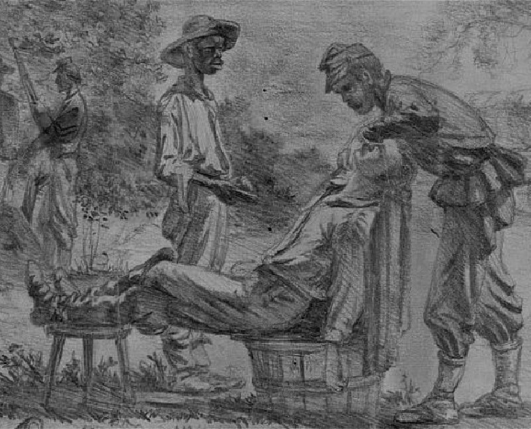 „Barber in civil war, Shaving in camp near Culpeper, Virginia, 1863” „Цирюльник на гражданской войне, бритье в лагере недалеко от Кюлпепера, Вирджиния, 1863 г.”, Взглянем поближе: Гравюра встречается и в таком виде: