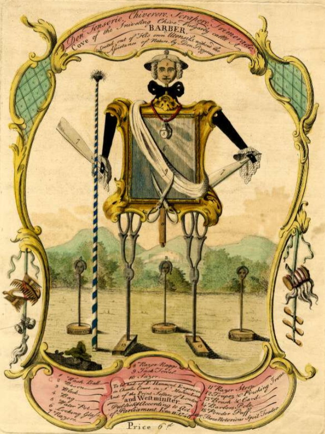 Активно работал в периоде 1735-1755 гг. Нет других данных. „Barber” „Цирюльник”, 1746 г.! Карикатура цирюльника, показывающая фигуру, составленную из орудий, связанных с ремеслом; тело, являющееся зеркалом, бритвы для рук и т. д. Вглянем поближе: С 2013 г. с кайфом бреюсь опасной бритвой пять раз в неделю, в три прохода.