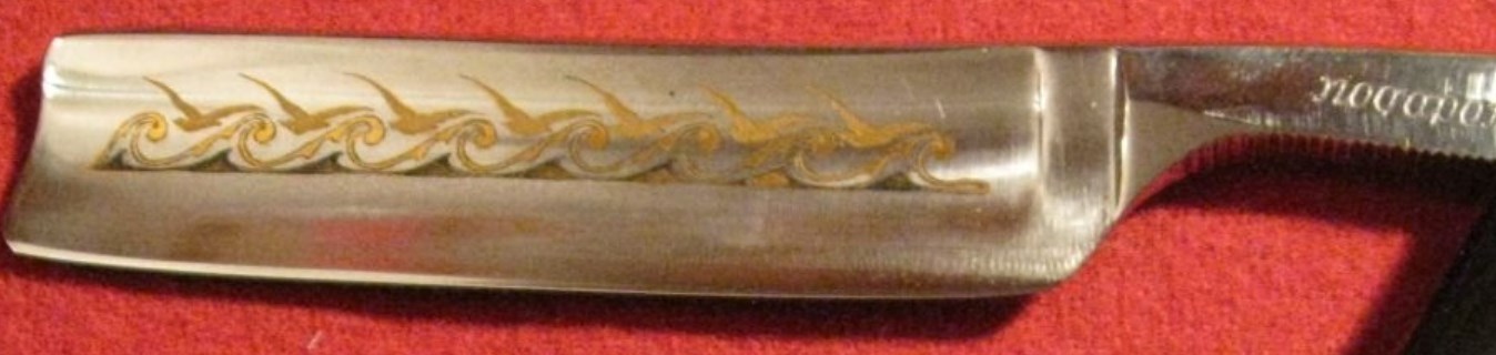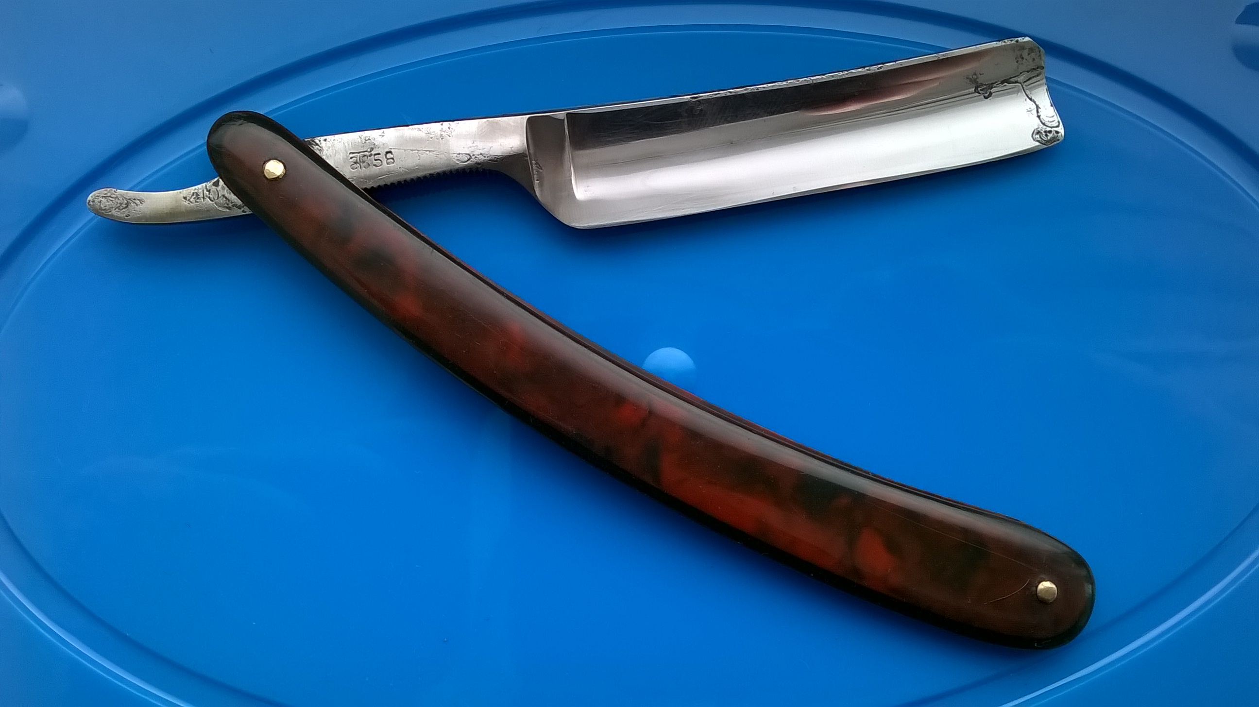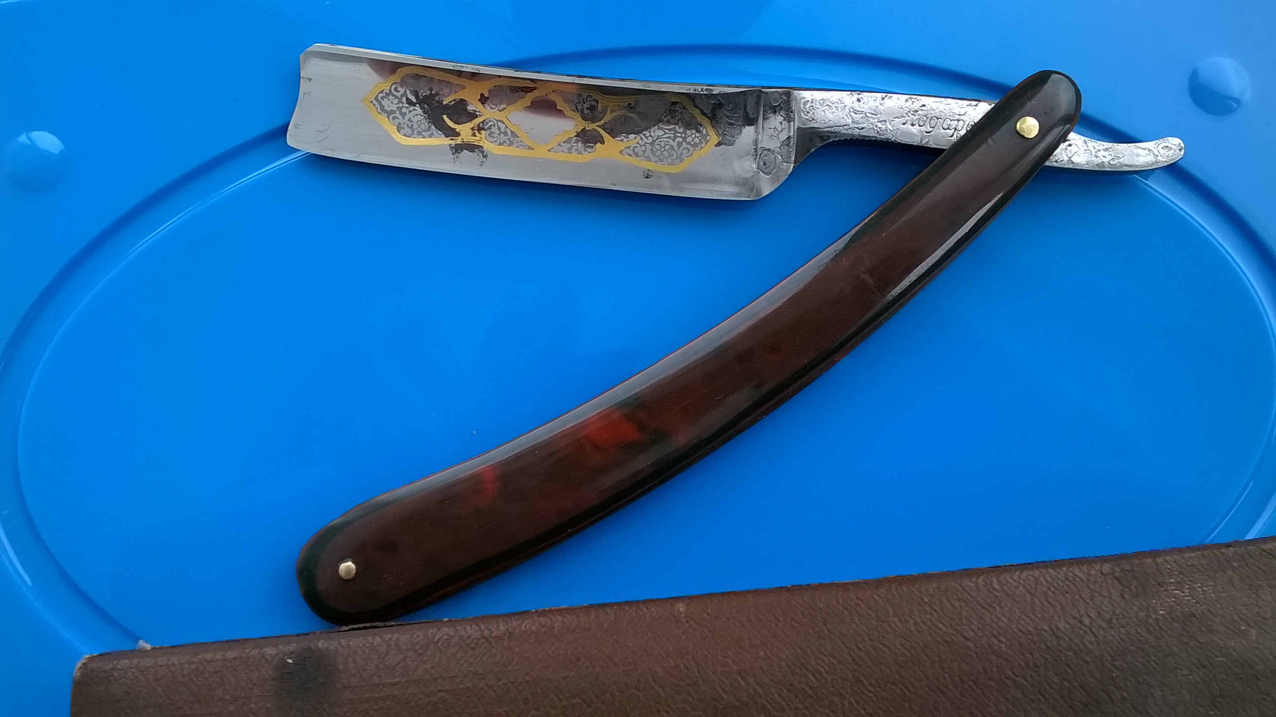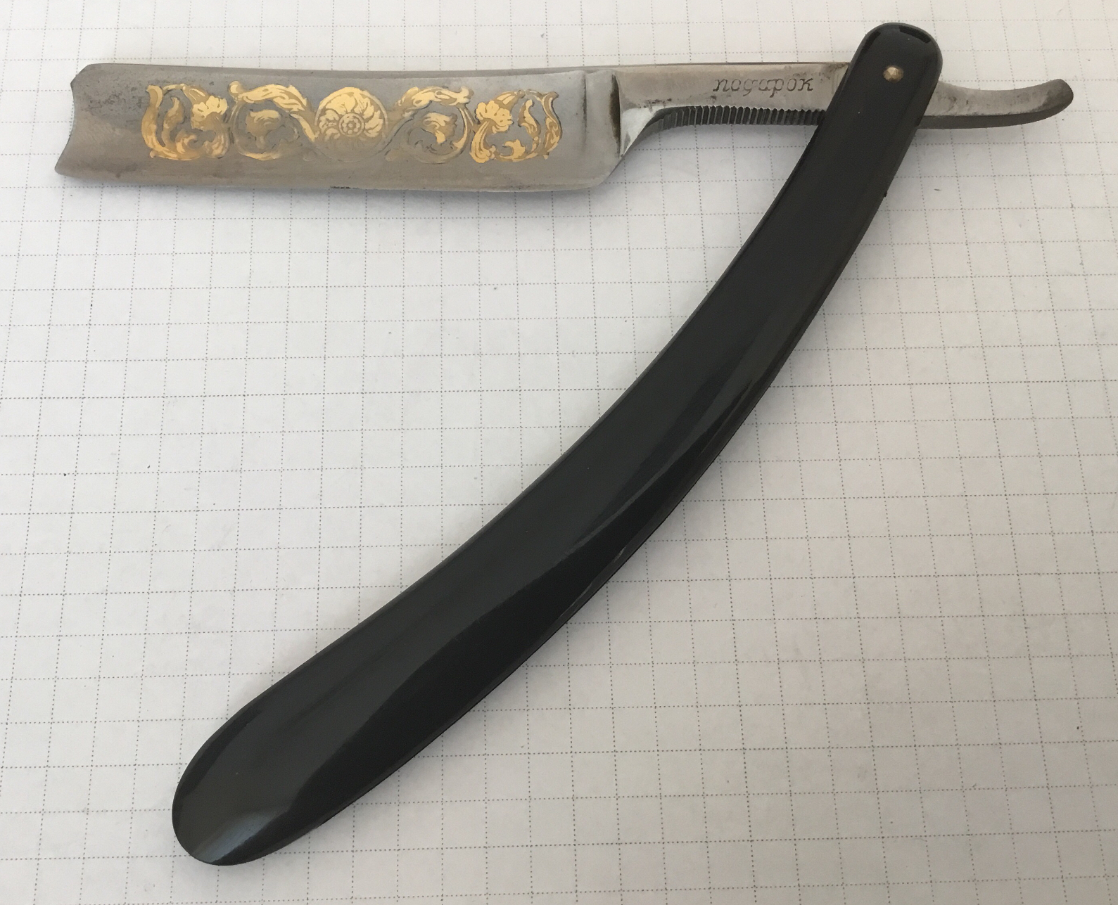 Это заводская бритва?Хазяин уже новый и он не обидится. Можете пользоваться новым фото. Это была серия Подарков с орнаментами. Предположу что этот из той же серии. Ранее такой не встречал.