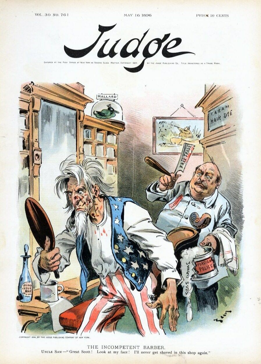 Карикатура из выпуска 16 Мая 1896 года. Подпись: "Некомпетентный барбер" Дядя Сэм - "Великий Скотт! (Фраза, выражающая крайнюю степень удивления, недоумения или волнения, испуга) Посмотри на моё лицо! Я больше никогда не буду брится в этом Барбершопе снова" Надписи: На бритве - "Свободная торговля", на кружке для пены - "Внешняя политика", на пене - "Пена Джинго" (jingo - это типа ксенофобия, агрессивный национализм), бирка на рубашке барбера - "Кливленд"