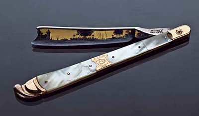 Об удивительном экспонате рассказал ейчанин Ю.П. Коротков, крёстный сын ейского чемпиона по борьбе, всемирно известного спортсмена Ивана Поддубного. История появления царской бритвы в Ейске такова. В доме Георгия Зозули, хозяина сапожной мастерской, где шили великолепные хромовые сапоги, одно время квартировал цирюльник самого российского императора Николая II. К квартиранту хозяева относились с уважением, не раз помогали в быту. Когда брадобрей уезжал, то захотел отблагодарить Георгия Лукича и супругу (она была родной тётей Юрия Короткова) и оставил на память великолепную бритву производства "Wald Solingen". Набором из двенадцати таких бритв пользовался сам цирюльник, брея российского правителя. На лезвиях бритв красовался рисунок царской короны с нависшим над ней изогнутым мечом. Зозуля был дружен с легендой спортивной борьбы Поддубным. Как-то Георгий Лукич заметил, что старая приносит борцу много неудобств во время бритья. Тогда друг преподнёс Ивану Максимовичу поистине царский подарок - ту самую бритву императора Николая. По наследству бритвенные принадлежности Ивана Поддубного перешли на хранение к крестнику - Ю.П.Короткову. А он уже передал их в музей памяти своего великого крёстного. Добавлено спустя 6 минут 23 секунды: Опасная бритва императора Александра I. Москва. 1818. Золото, серебро, сталь, перламутр Волхвы не боятся могучих владык,