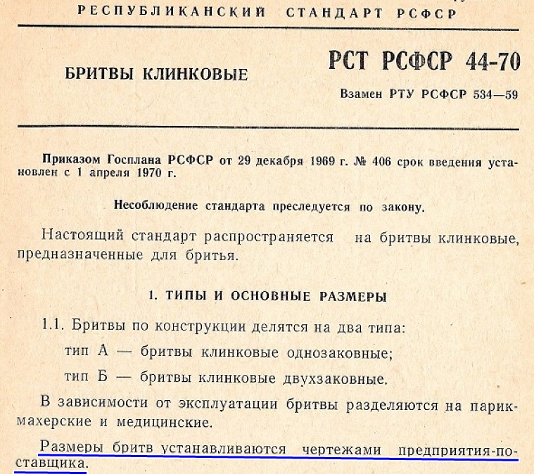 А вот более предыдуший стандарт РСТ РСФСР 44-70 очень интересный. Там написано что размеры бритв устанавливаются чертежами предприятия-поставщика
