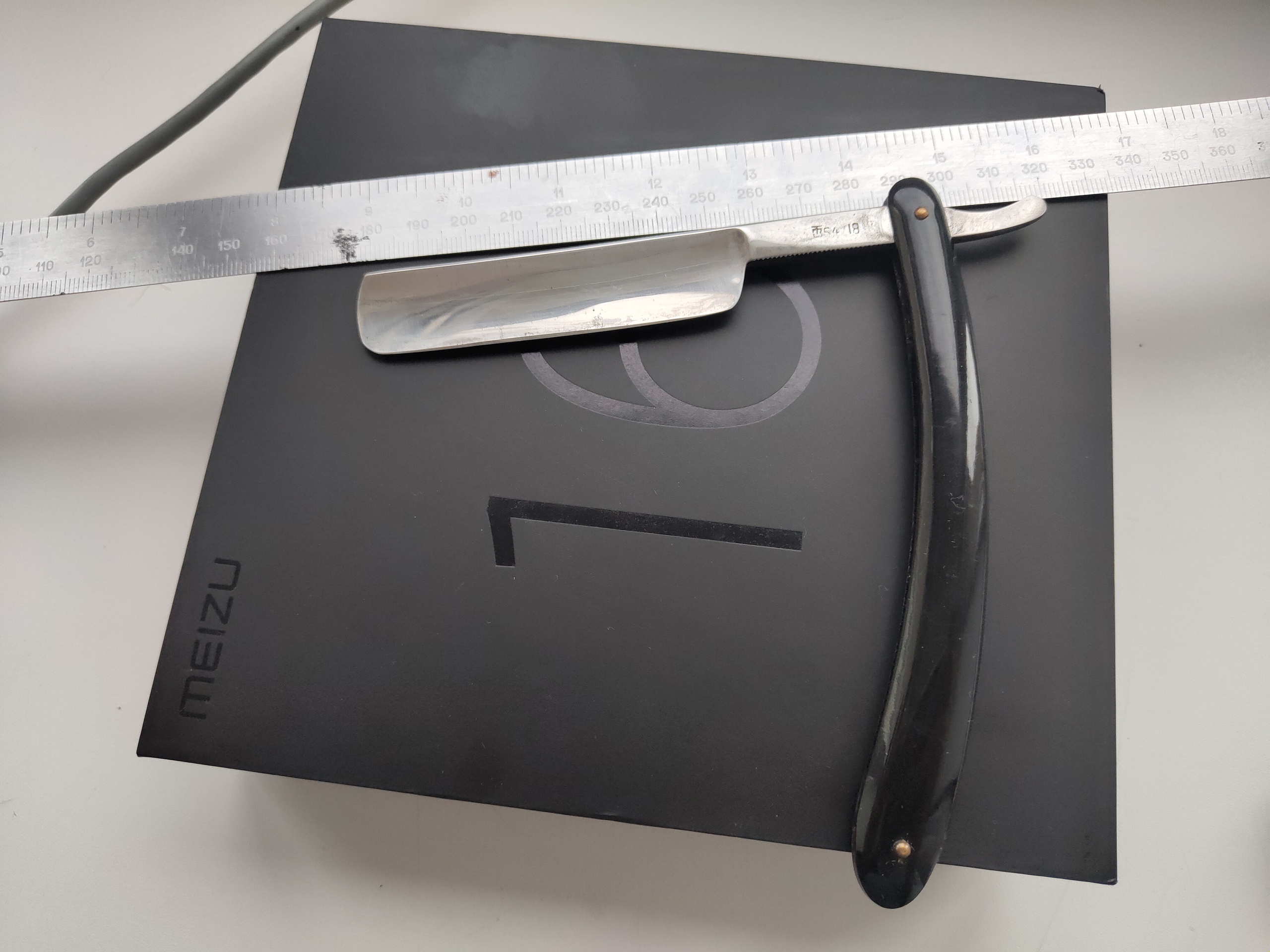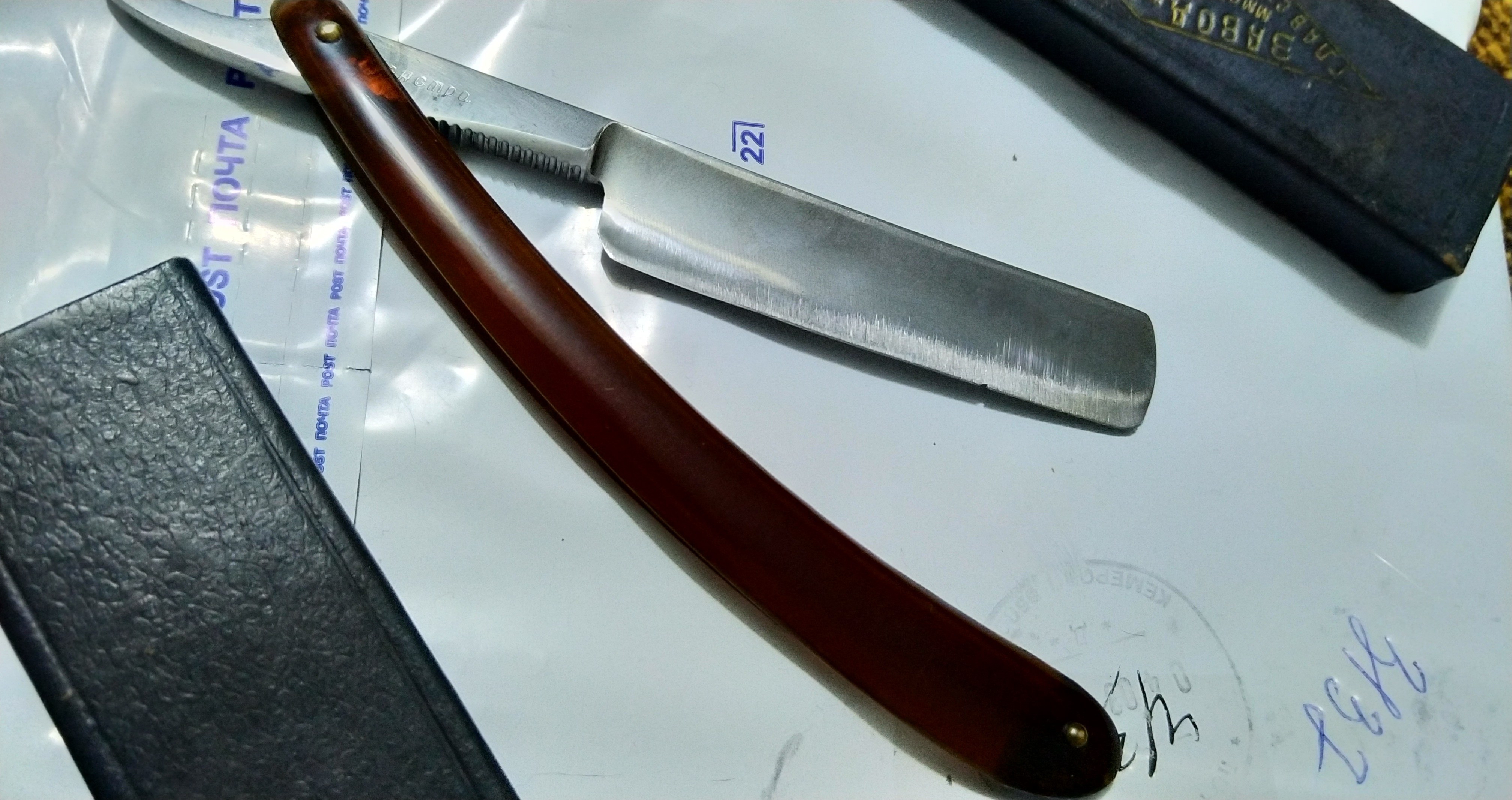 Красивая такая ручка, никогда ранее у меня не было с таким рисунком.На мой взгляд, сталь тут отличается от бритв 50-60-х годов, в лучшую сторону. Мягче, что ли, в плане бритья и более понятна в заточке. Коробочка, наверное тоже оригинальная.По крайней мере, приехала именно в ней.