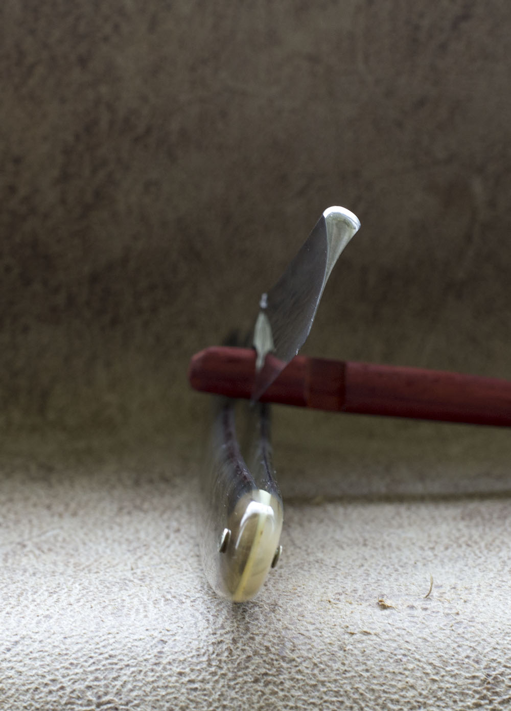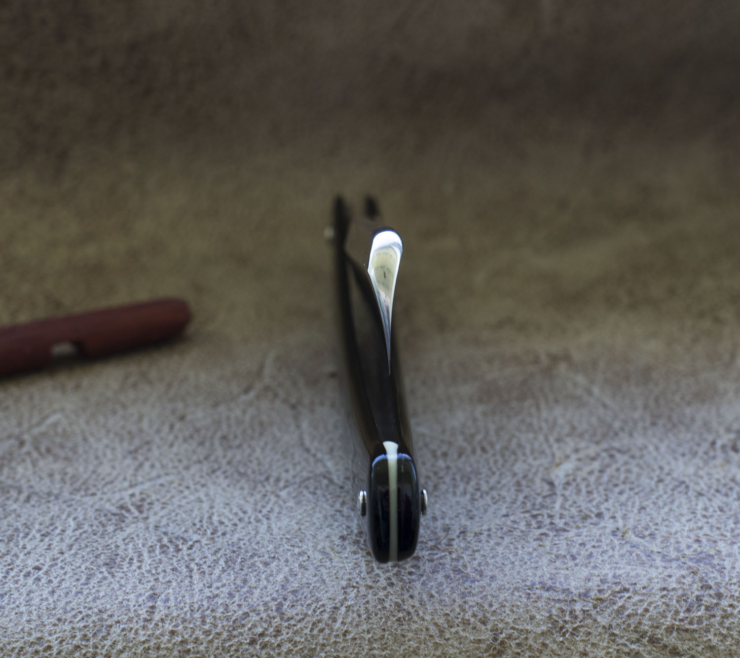 Опасная бритва японского производства. Новая неиспользованная бритва 50, 60-х годов, ширина 6/8, имеет схожую с камисори форму полотна и ассиметричную спинку, но в отличие от камисори точатся эти бритвы как обычные европейки, камень оставляет с двух сторон равномерную узкую фаску, что придает им более эстетический вид, а рукоять и эрль с выемкой под палец дают возможность пользоваться ей как обычной европейской бритвой, к тому же менее длинное чем у большинства европеек полотно дает лучший контроль и удобство в бритье, сочетает в себе лучшие качества камисори и европейских холлоу граундов. Посмотрите на фото носика чтобы увидеть ассиметричное строение полотна. Продано Spoiler Show