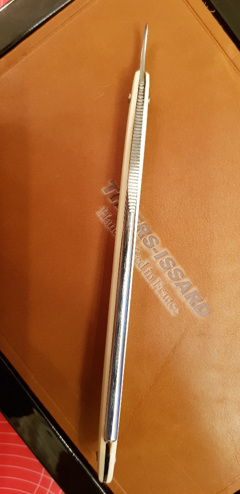 C широким лезвием, выкованным около 70-80 лет назад из очень качественной серебристой углеродистой стали Silver Steel, позолота, ручка - честно говоря не точно - 2 варианта: полированный рог буйвола или целлулоид .