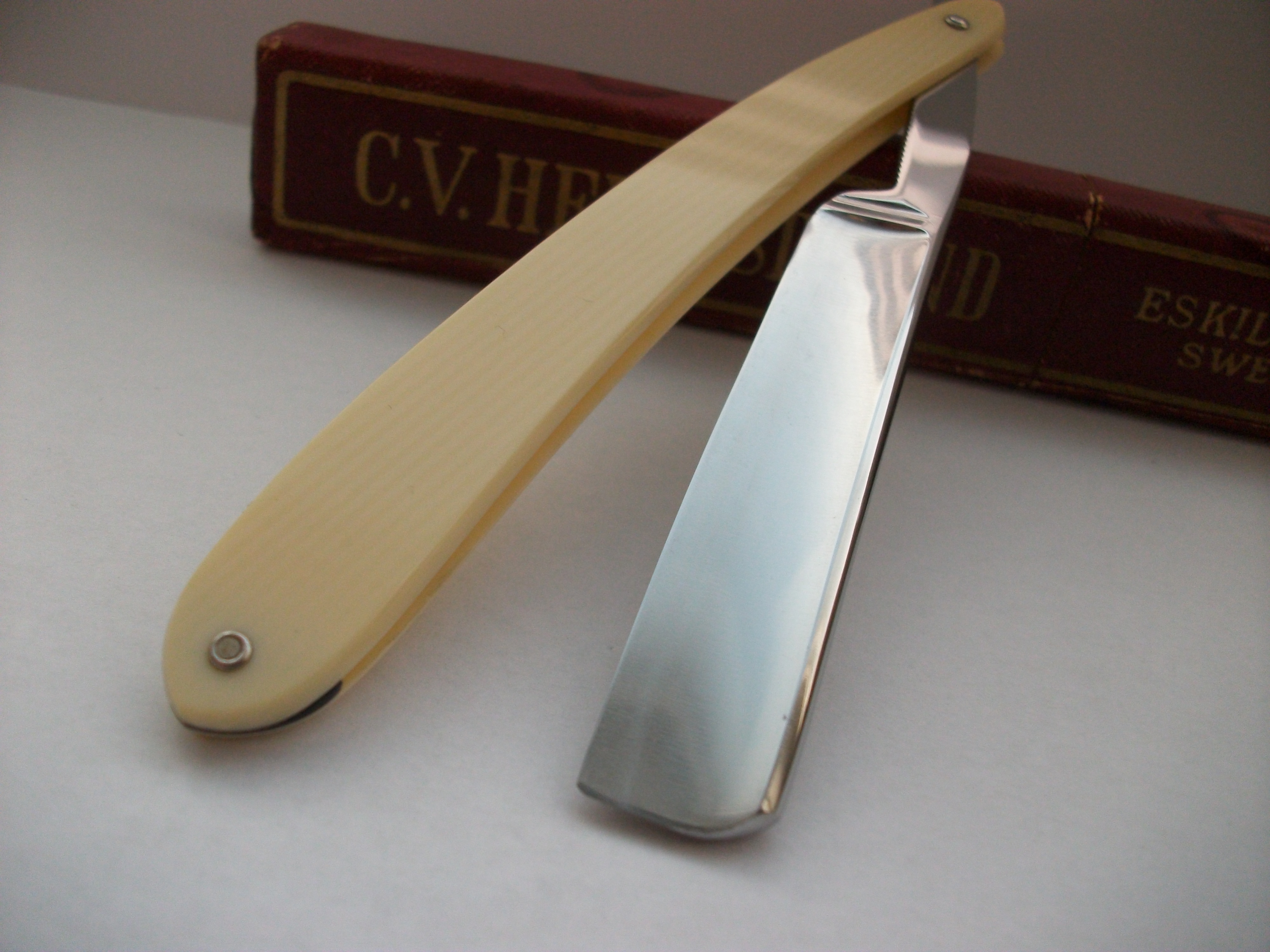 Продается от mister maloiC.V. Heljestrand хороший старый швед: углеродистая сталь, ручка из слоновой кости - все в лучших традициях славного Heljestrand. В наличии родной кофр. Бритва небольшая, ширина полотна 17мм, вогнутость полная.