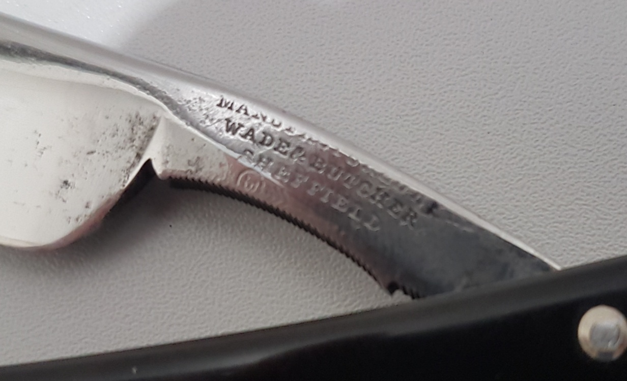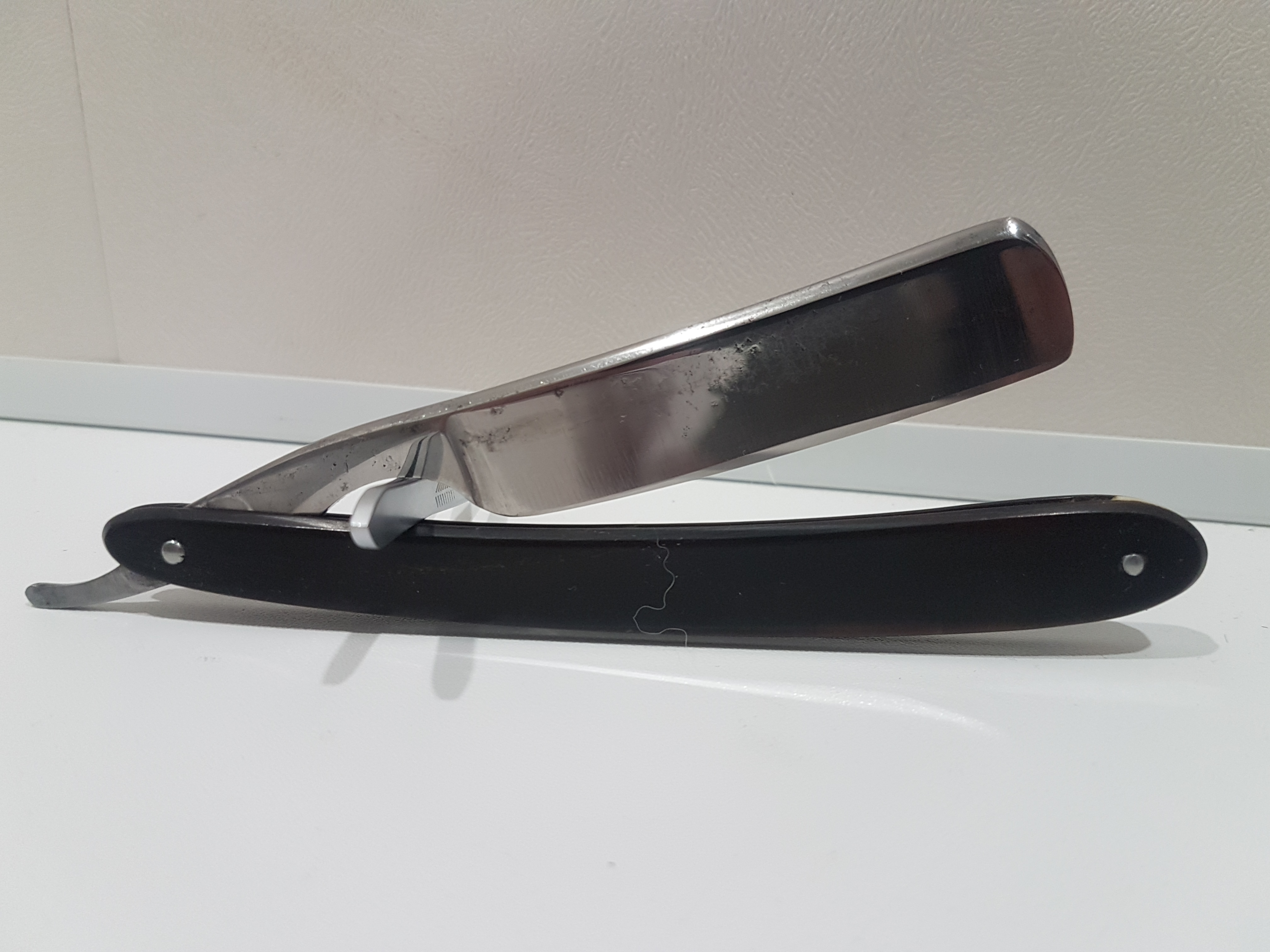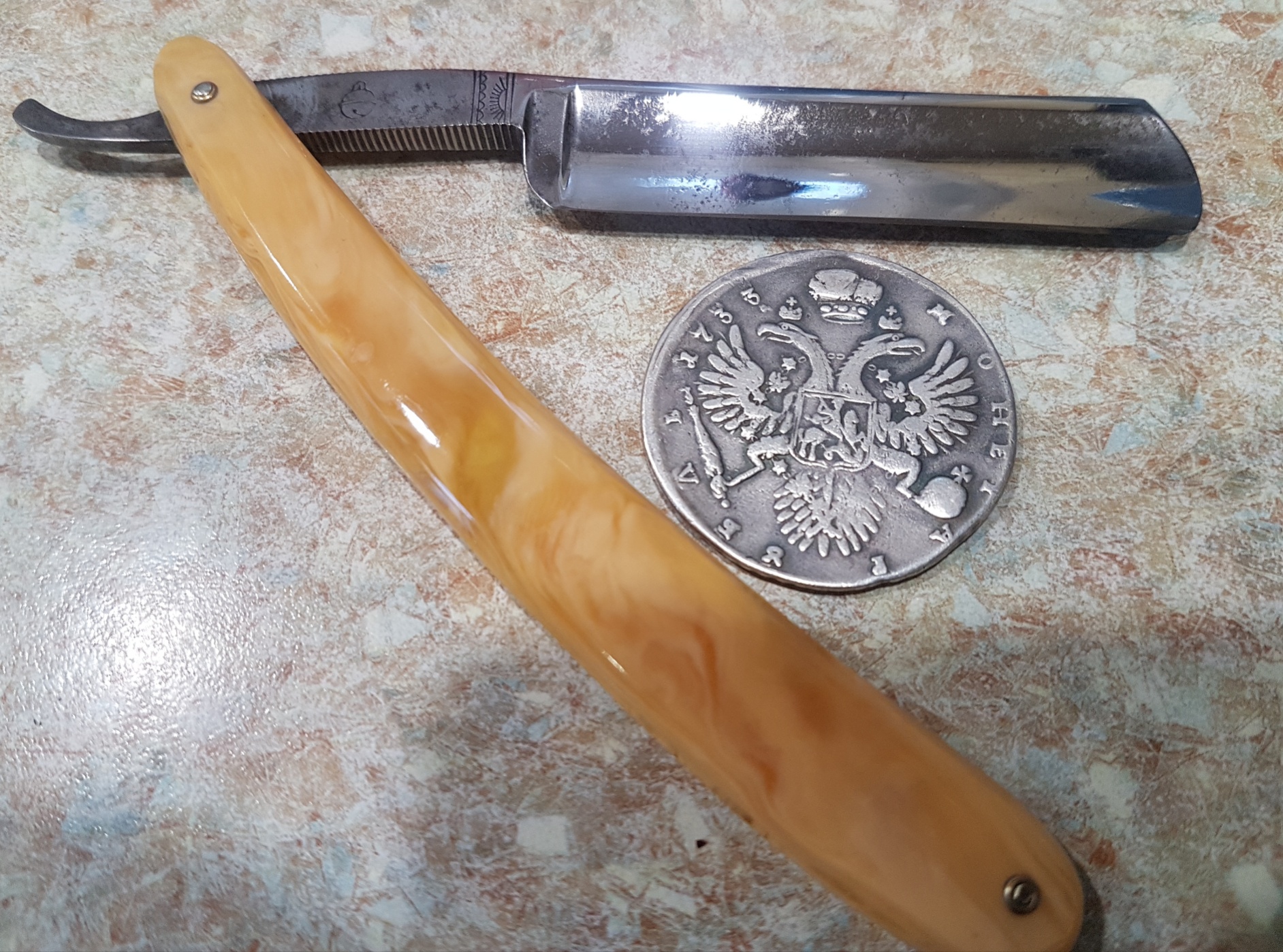 Продаётся от VolgarПредлагаю к продаже массивный полуулыбчивый клин производства Rice & Skinner .BANGOR. USA. Выработан в период с 1877 по 1883 год. Длина клинка 75 мм. Ширина 20+ мм. Ручка натуральный рог в удовлетворительном состоянии. Бритва только чистилась,ничего не менялось. Имеются небольшие следы времени Режущая кромка тонкая ровная и чистая. Геометрия отличная. Комфортный рез. Заточена, тест на рез волоса проходит. ПРОДАНА.