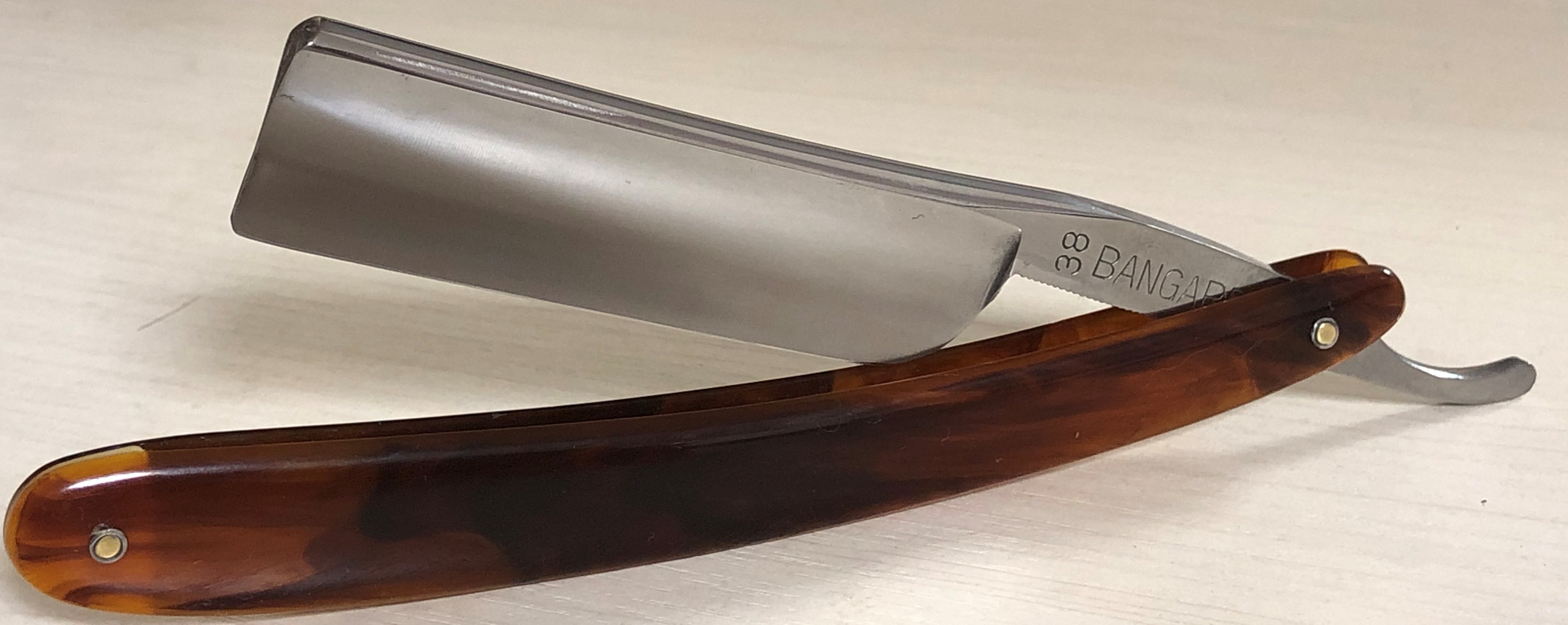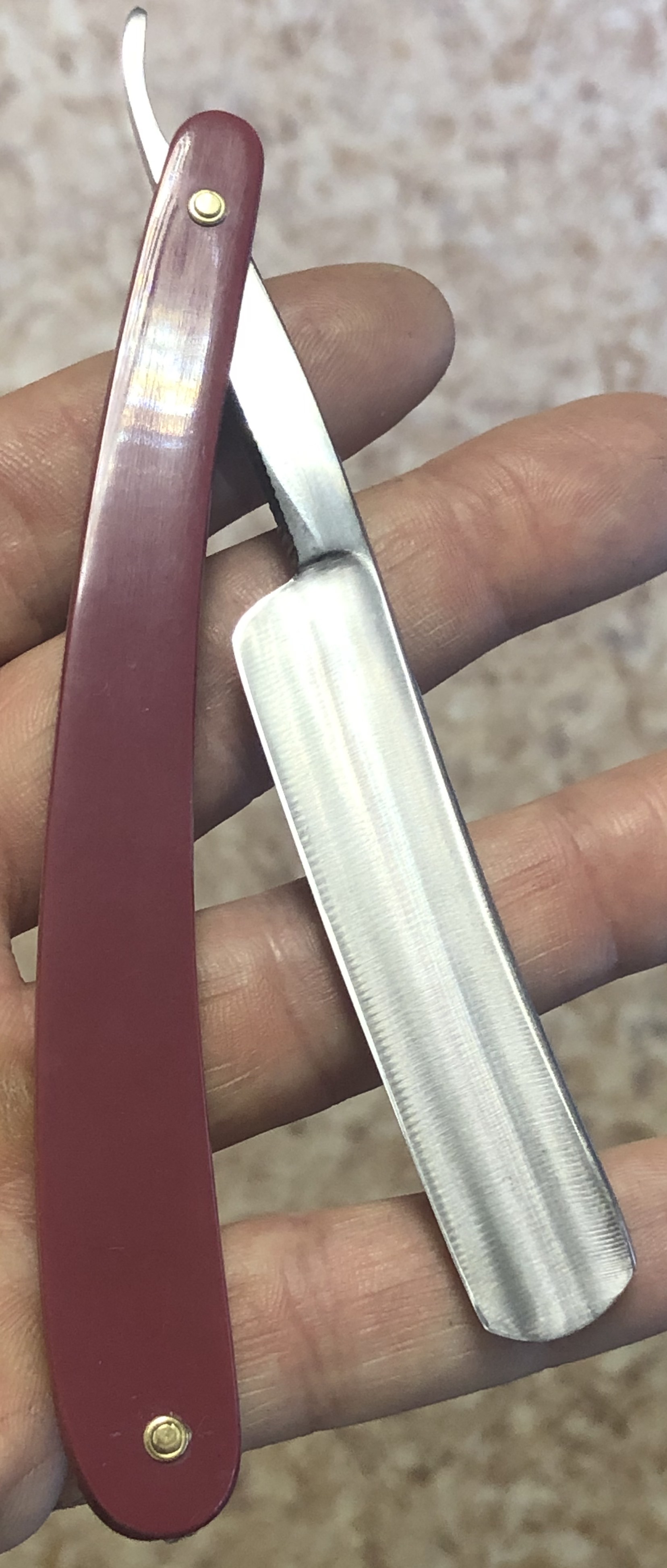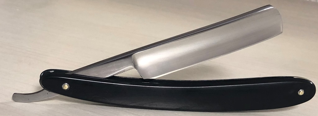 Красивая и практичная бритва.Поменял осевой пин, так как закрывалась бритва криво изначально, заодно и второй пин заменил, для порядка.Клинок не имеет следов пользования.Немного освежил металл и все. Идеальная геометрия. Кромочка равномерна по всей длине.За счет пластиковых накладок бритва не требует излишнего ухода, да и эстетически смотрится очень приятно.Клинок среднего размера, скупе с довольно ощутимым весом будет отличным вариантом для новичка и не только.Заточена и готова к бритью.