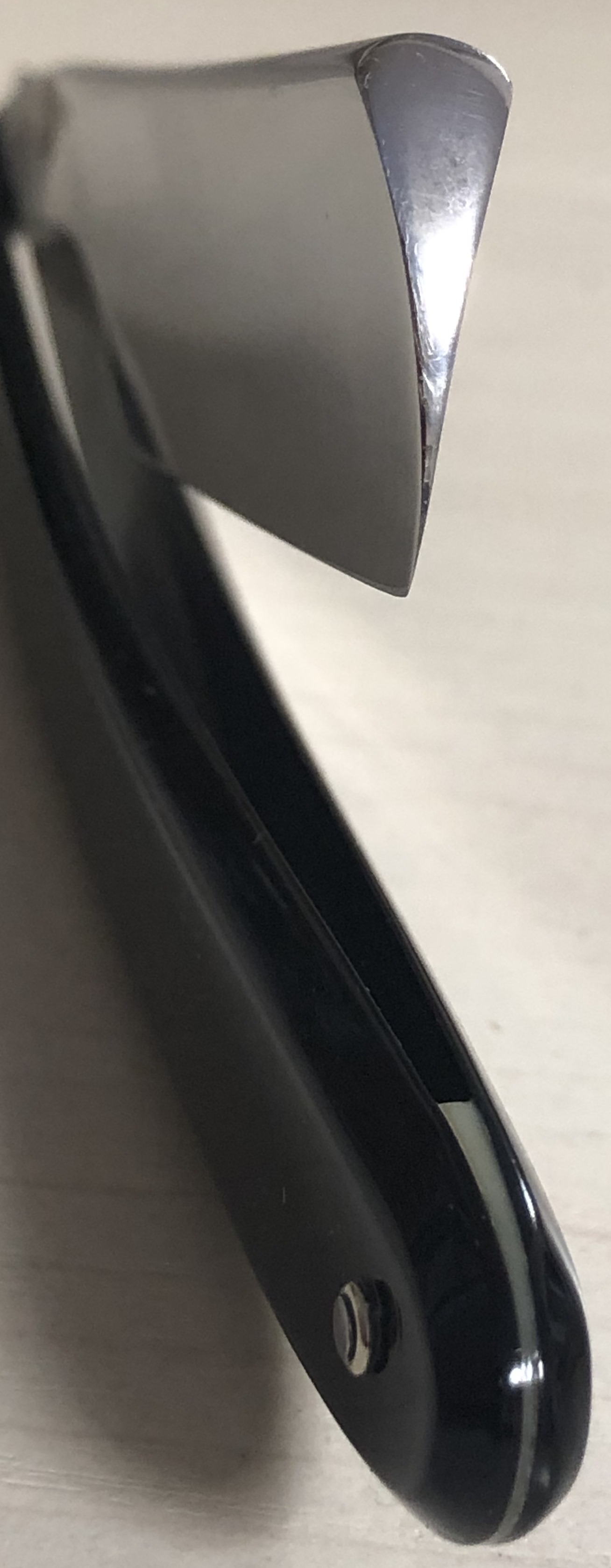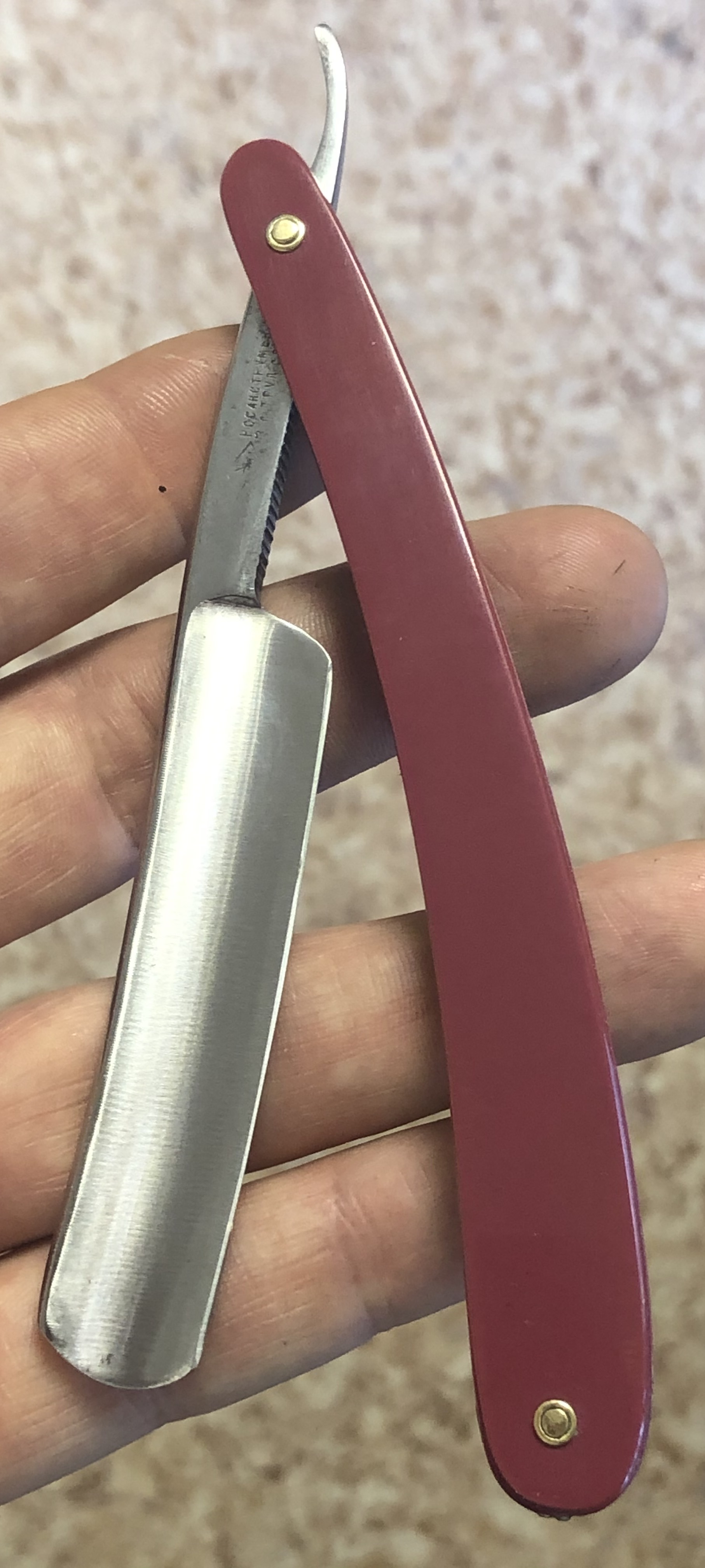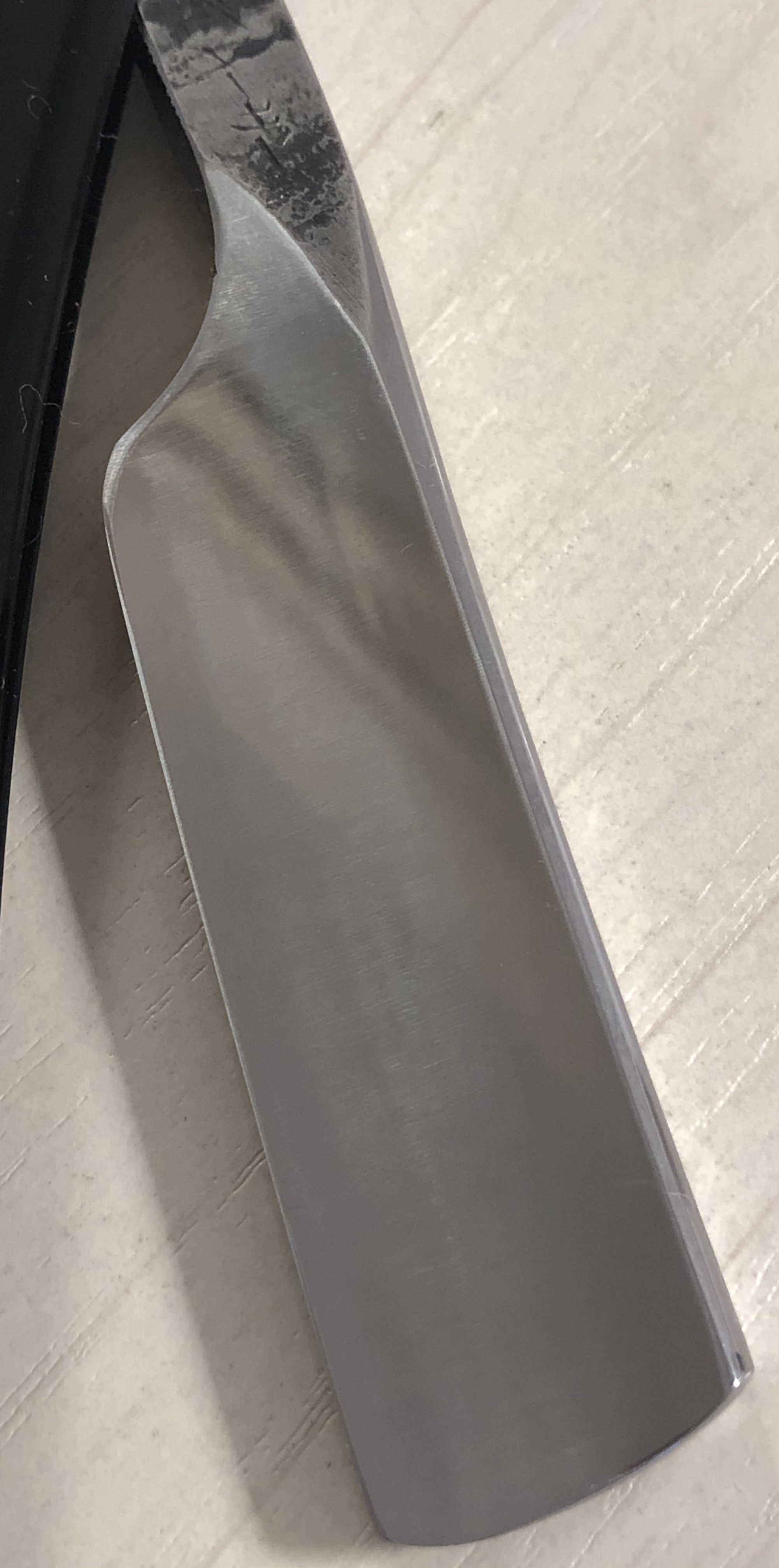 По всей видимости бритва в пользовании не была,судя по отсутствию следов от заточных камней на обушке, но была подвержена неправильной попыткой заточки, о чем говорят штрихи на лицевой стороне полотна.Это место немного полирнул, а обратную сторону клинка перешлифовал и также отполировал. Заменил пины и убрал окисление и патину в районе осевого пина.Сталь чистая, без видимых дефектов.Идеальная геометрия полотна. Заточена и готова к бритью. Коробочка, естественно неродная, зато пролетарского цвета, соответствующая духу того времени.